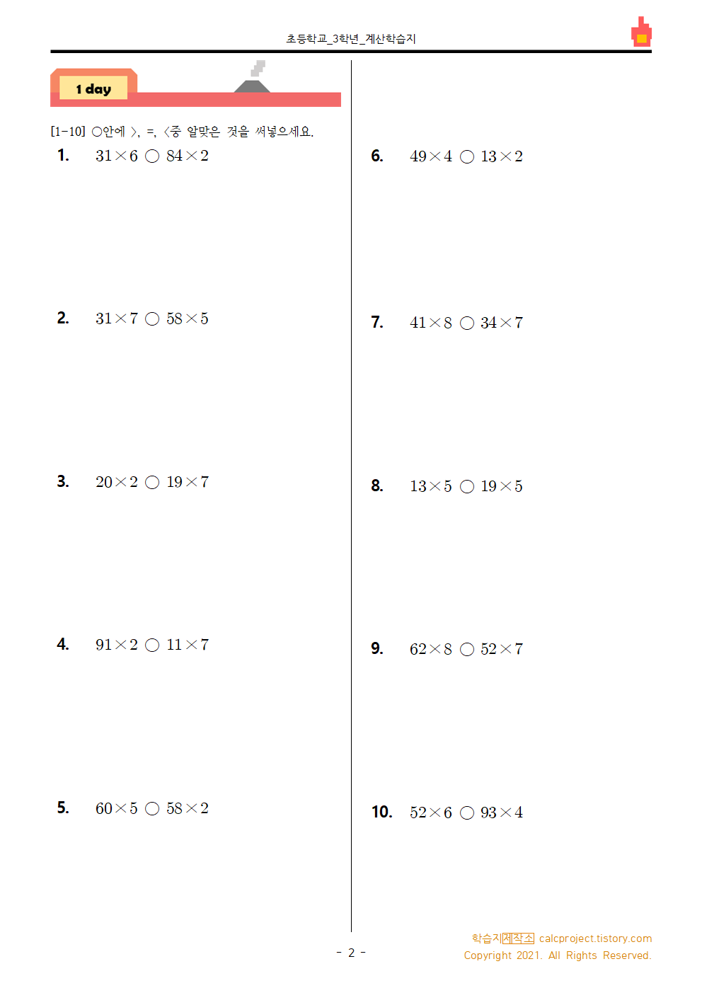 이번 학습지는 곱의 크기를 비교하는 학습지로, 곱셈을 하는 과정과 수를 비교하는 과정이 필요합니다. 두 수 중 어떤 수가 더 큰지 알아보고 알맞은 부등호를 써넣어봅시다.