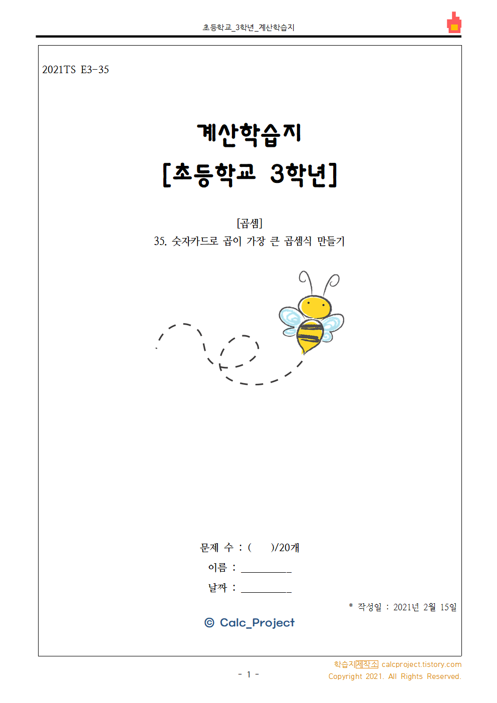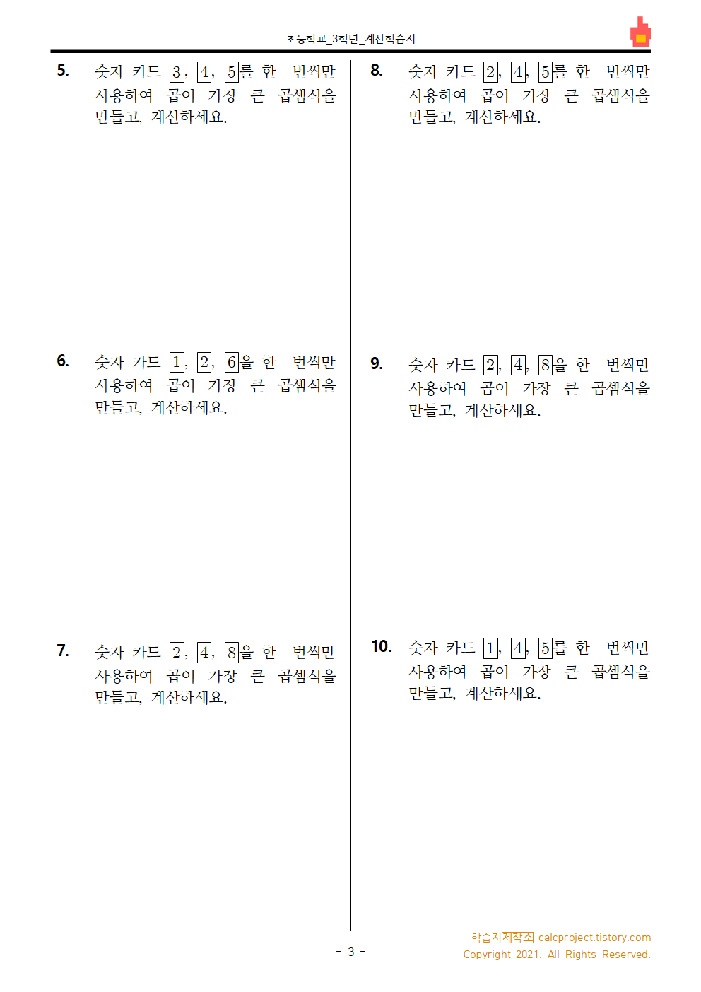 #태그 : 초3, 초등학교 3학년, 곱셈, 두 자리 수, 한 자리 수, 숫자카드 문제, 숫자카드로 곱이 가장 큰 식 만들기, 학습지, 다운, 다운로드, PDF, 학습지제작소