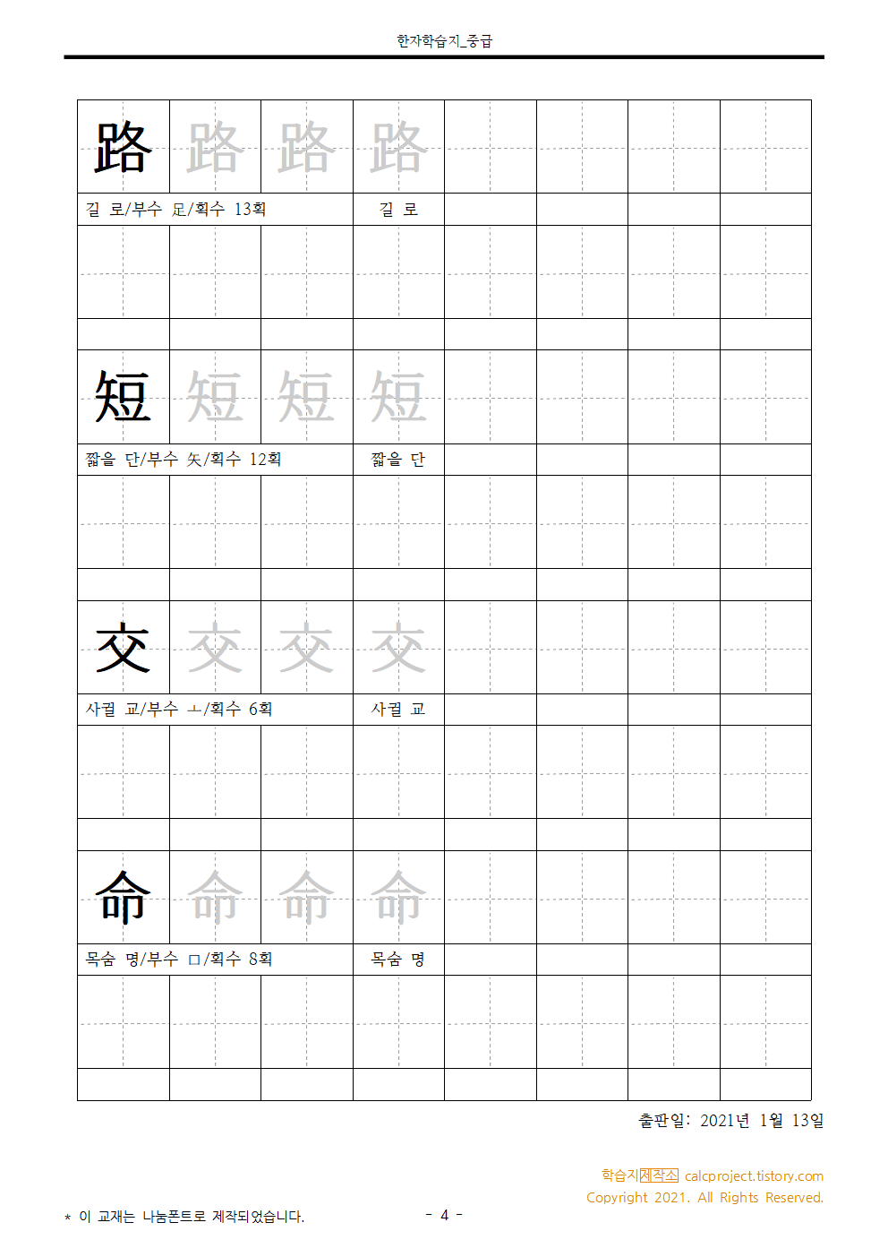 | [중급] 한자쓰기연습 Day 9 (6급, 5급 선정한자 연습장) (0) | 2021.01.15 |