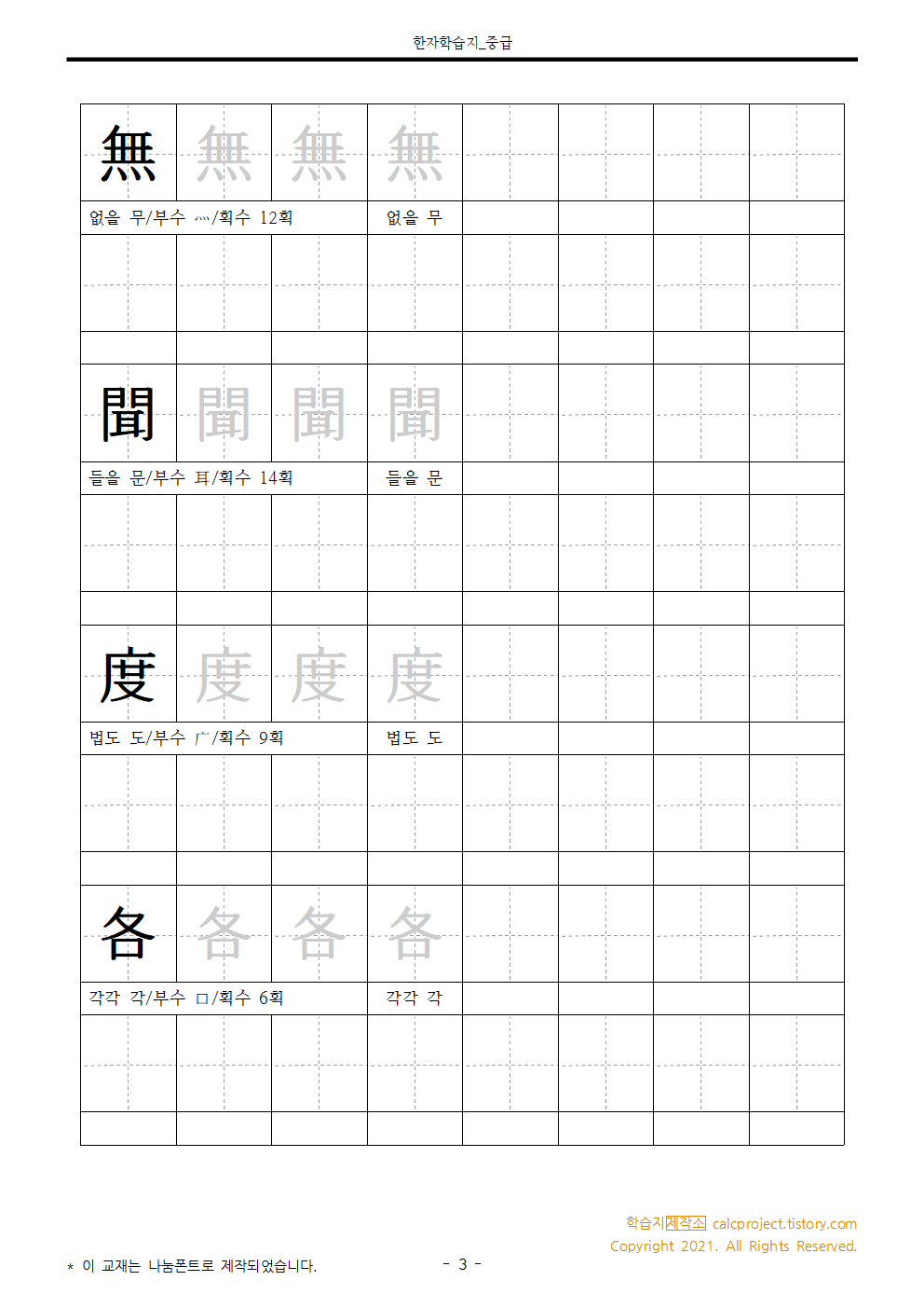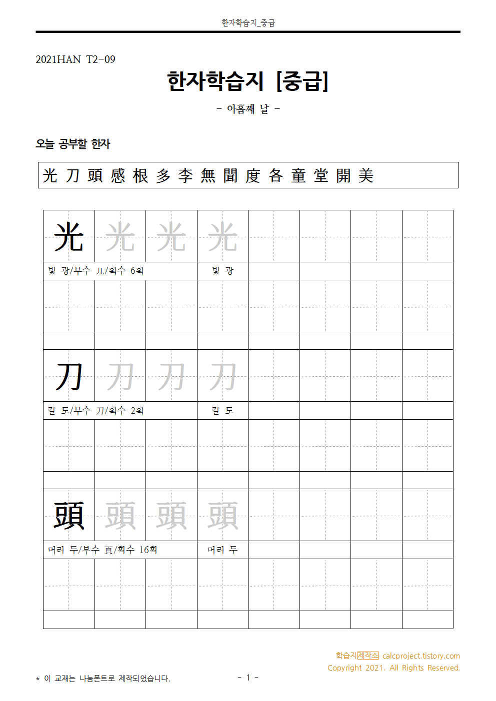 | [중급] 한자쓰기연습 Day 7 (6급, 5급 선정한자 연습장) (0) | 2021.01.11 |