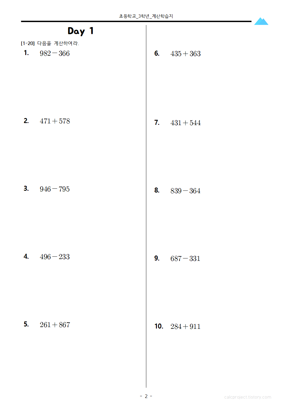 세 자리 수의 덧셈과 뺄셈 (1) 학습지를 풀지 않으신 분은 먼저 풀어보시고 오시기를 권장합니다.