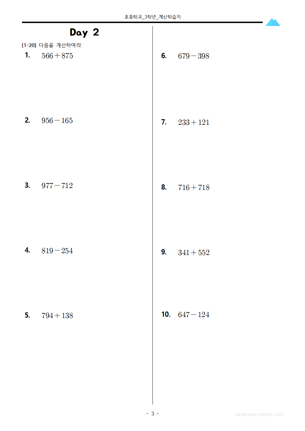 이 학습지는 초등학교 3학년 1학기 1단원 '덧셈과 뺄셈' 연산 학습지로,