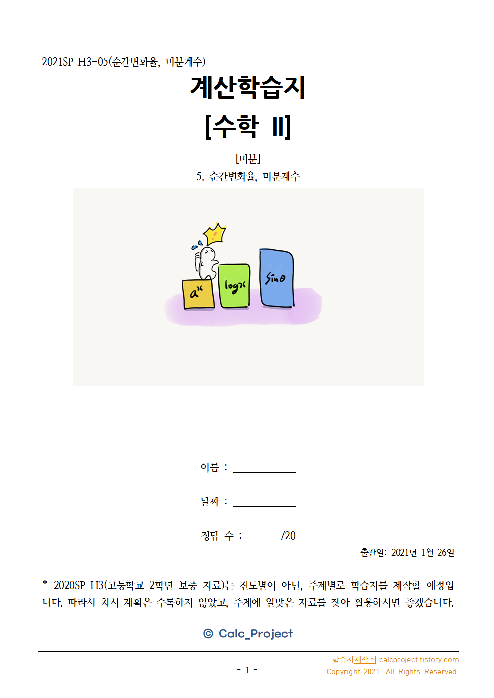 이번 학습지는 미분계수를 구하는 학습지로, 이차함수, 일차함수, 상수함수의 순간변화율을 구하는 내용으로 구성했습니다. 물론 나중에 도함수로 구해 간단히 계산할 수 있겠지만, 극한의 성질을 이용하여 계산해보시길 바랍니다. 논술형으로 제시될 때 대비할 수도 있고, 무엇보다도 미분의 의미를 공부할 때 바탕이 되기 때문입니다. 오늘 공부도 화이팅하시길 바랍니다. 감사합니다.