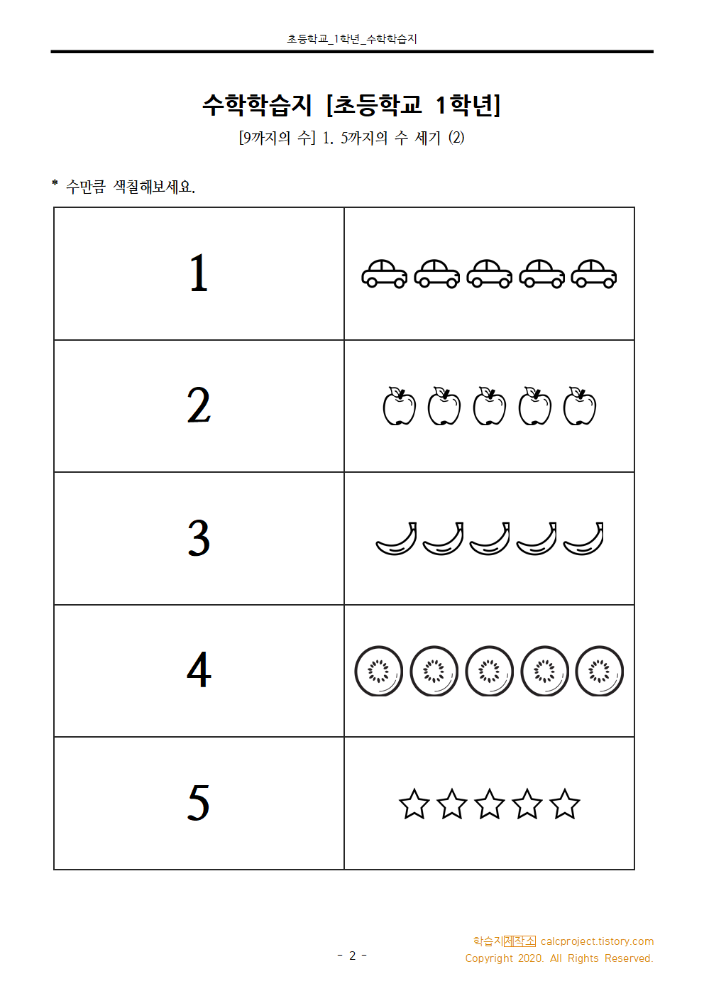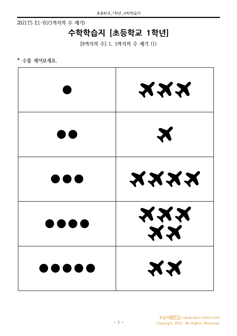 #태그 : 초1, 초등학교1학년, 5까지의 수 세기, 초등학교 1학년 수학 1단원 학습지, 활동지, 학습지제작소