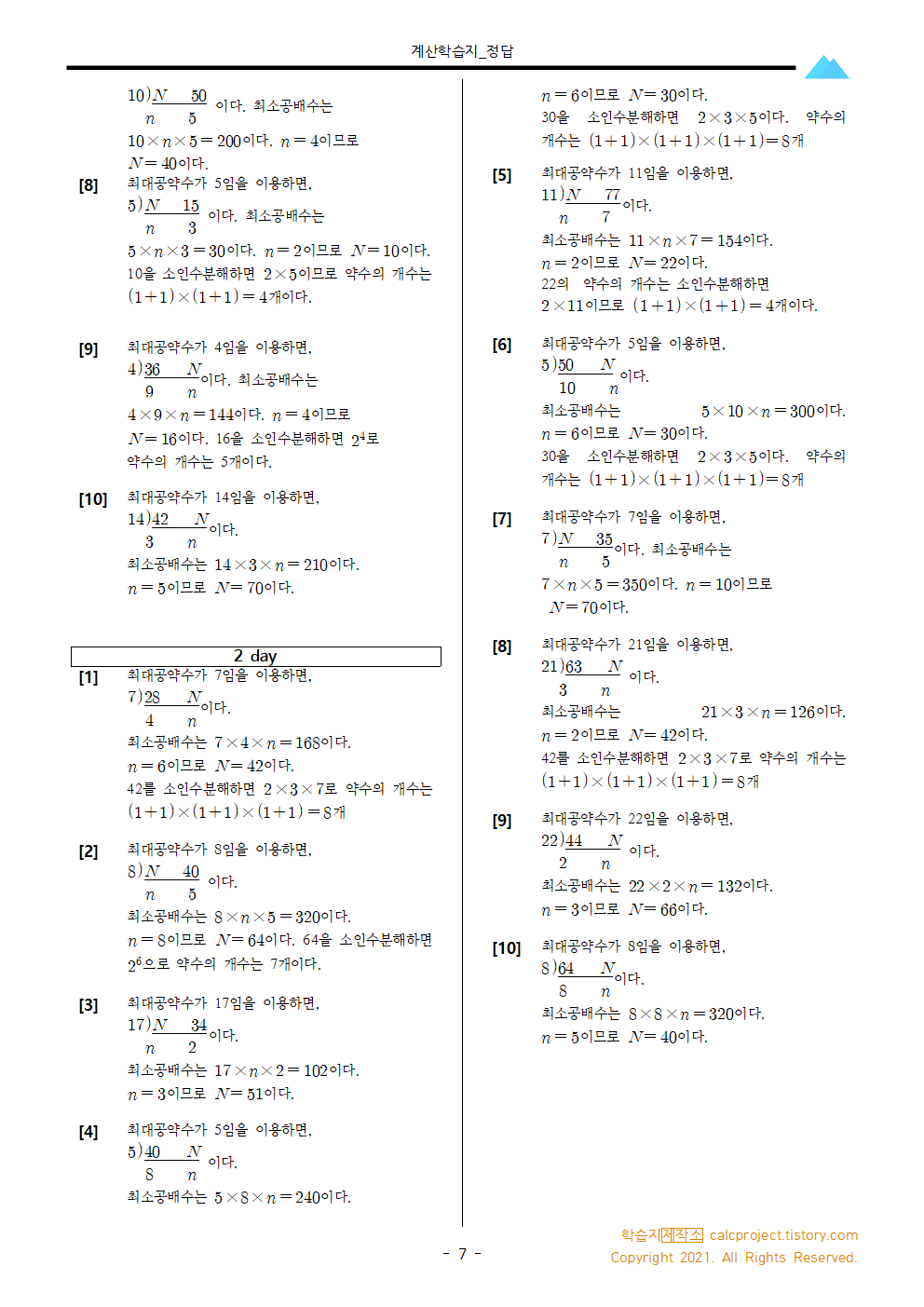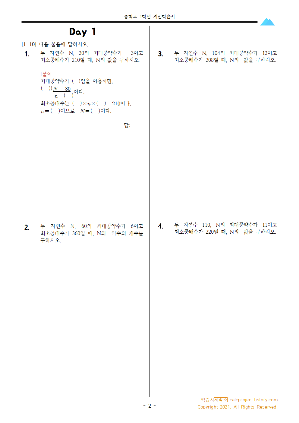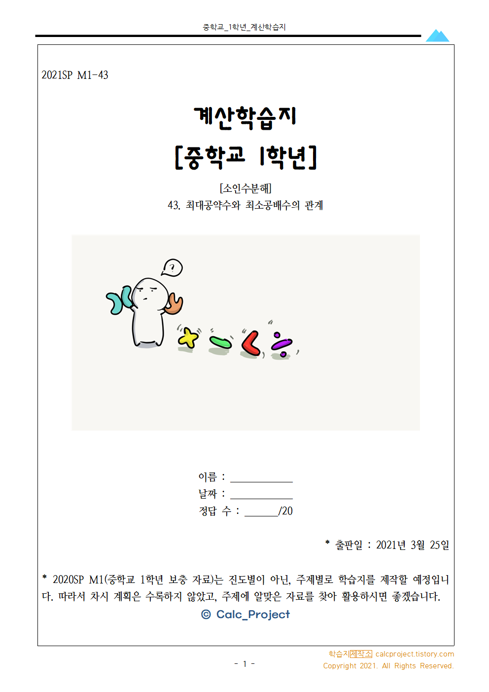 #태그 : 중1, 중학교1학년, 최대공약수, 최소공배수, 곱, 학습지, 수학학습지, 수학문제, pdf, 학습지제작소, A×B=G×L
