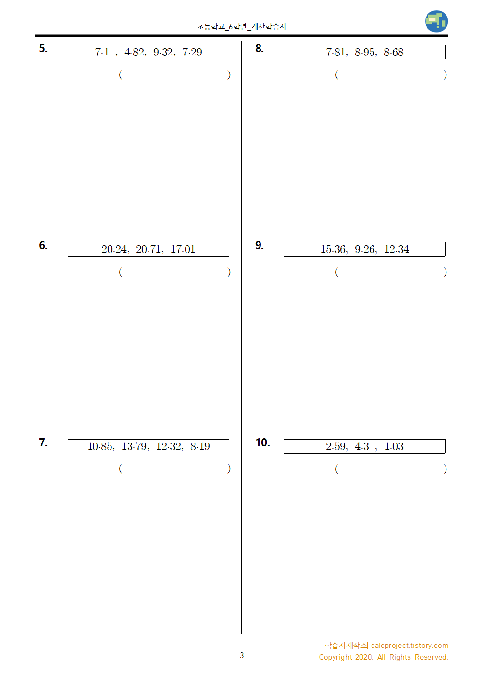 | [초6 소수의 나눗셈] 계산학습지 연산연습 가로셈 100문제 (6학년 1학기) (1) | 2021.07.10 |