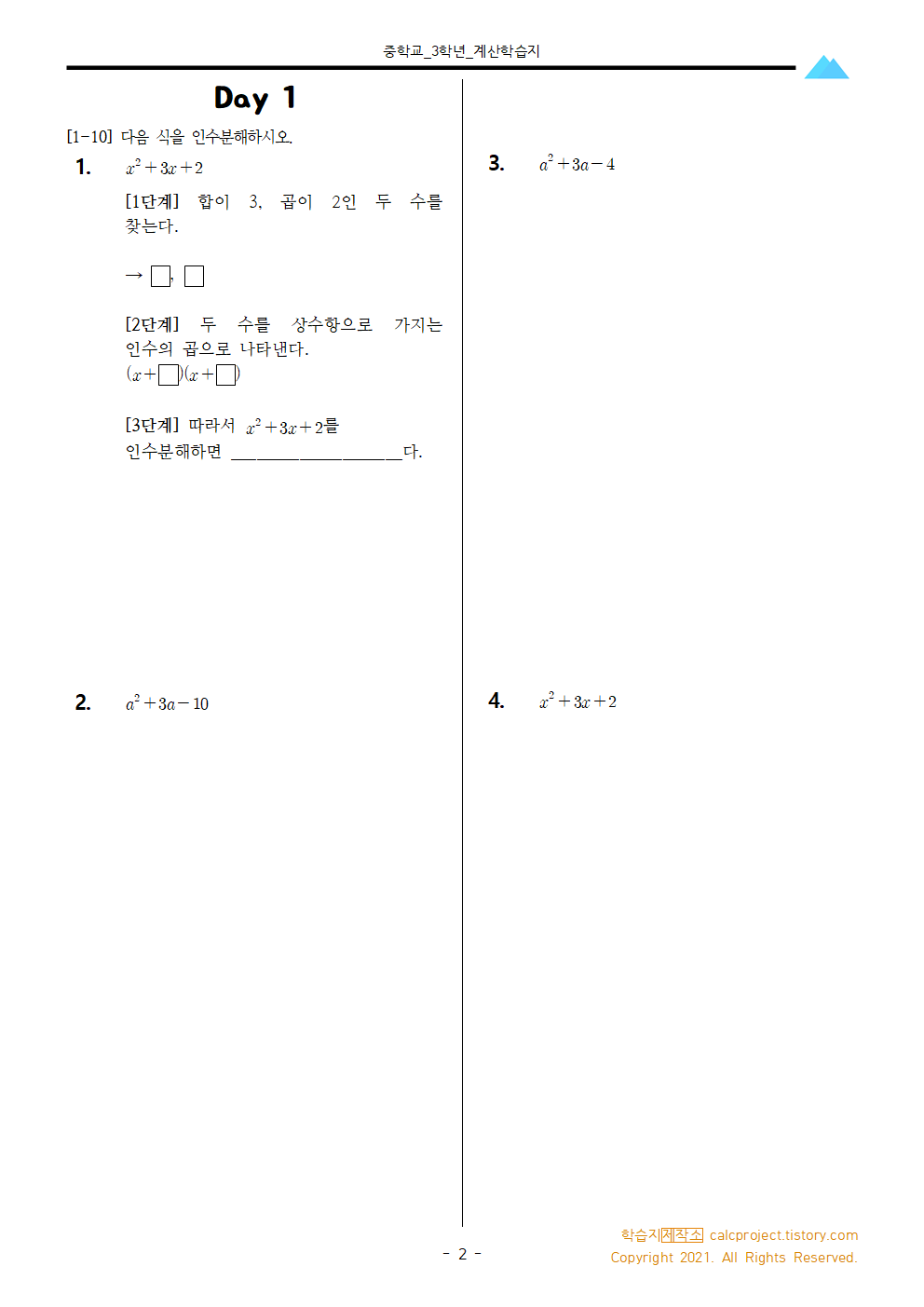 #태그 : 중3, 인수분해, 학습지, 중3내신 수학 연습문제, 다운, 다운로드, pdf, 학습지제작소