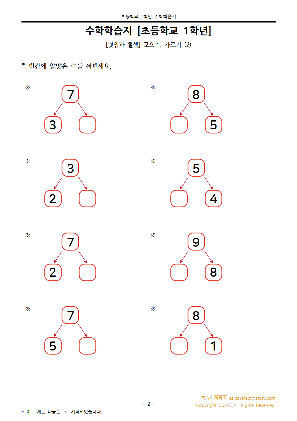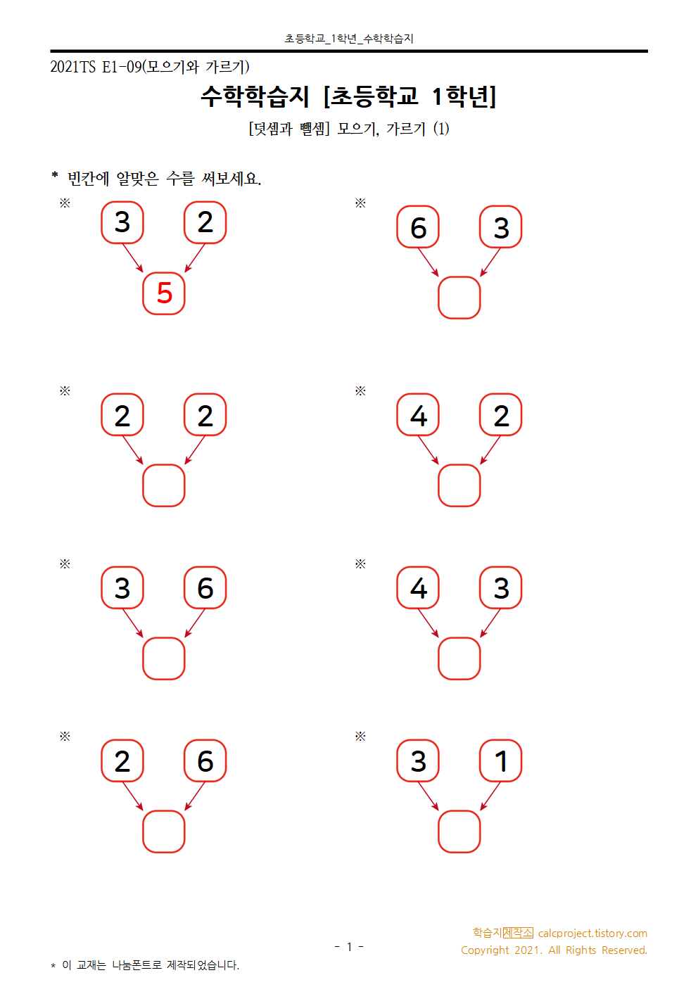 #태그 : 초1, 초등학교 1학년, 모으기, 가르기, 합성, 분해, 수의 분해와 합성, 모으기 가르기 학습지, 덧셈과 뺄셈 1학년 학습지, 다운, 다운로드, pdf, 학습지제작소