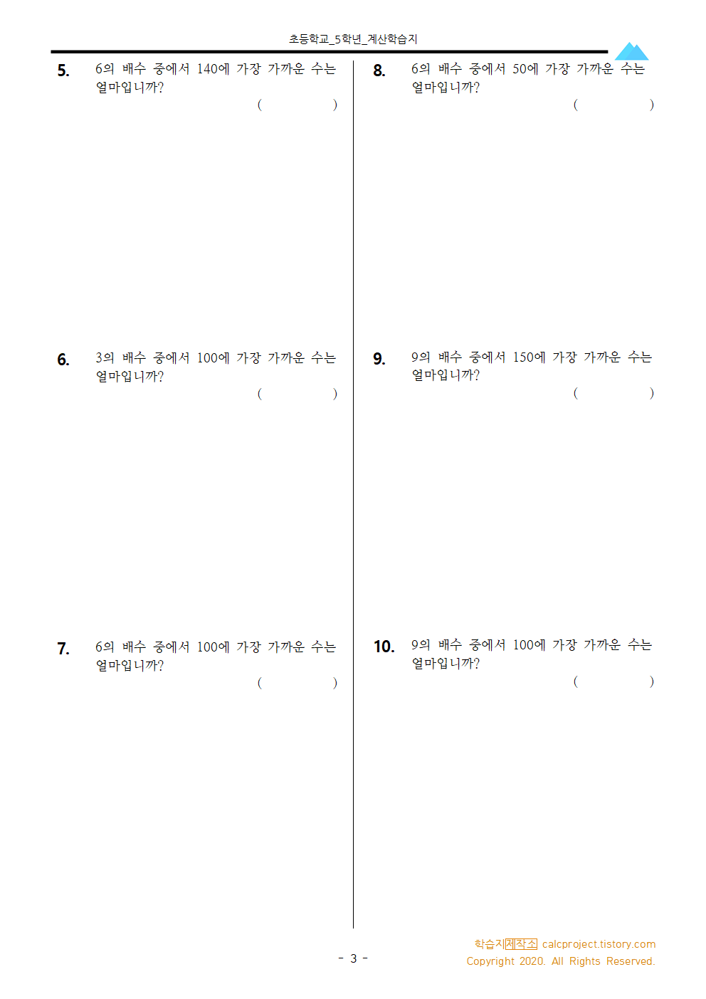 이번 학습지는 어떤 수와 가장 가까운 배수를 구하는 유형을 담았습니다. 배수의 개념을 적용하는 유형이다보니 20문항으로 학습지를 구성하였습니다. 배수의 개념과 비교하기를 차례대로 하면 문제를 풀 수 있습니다.