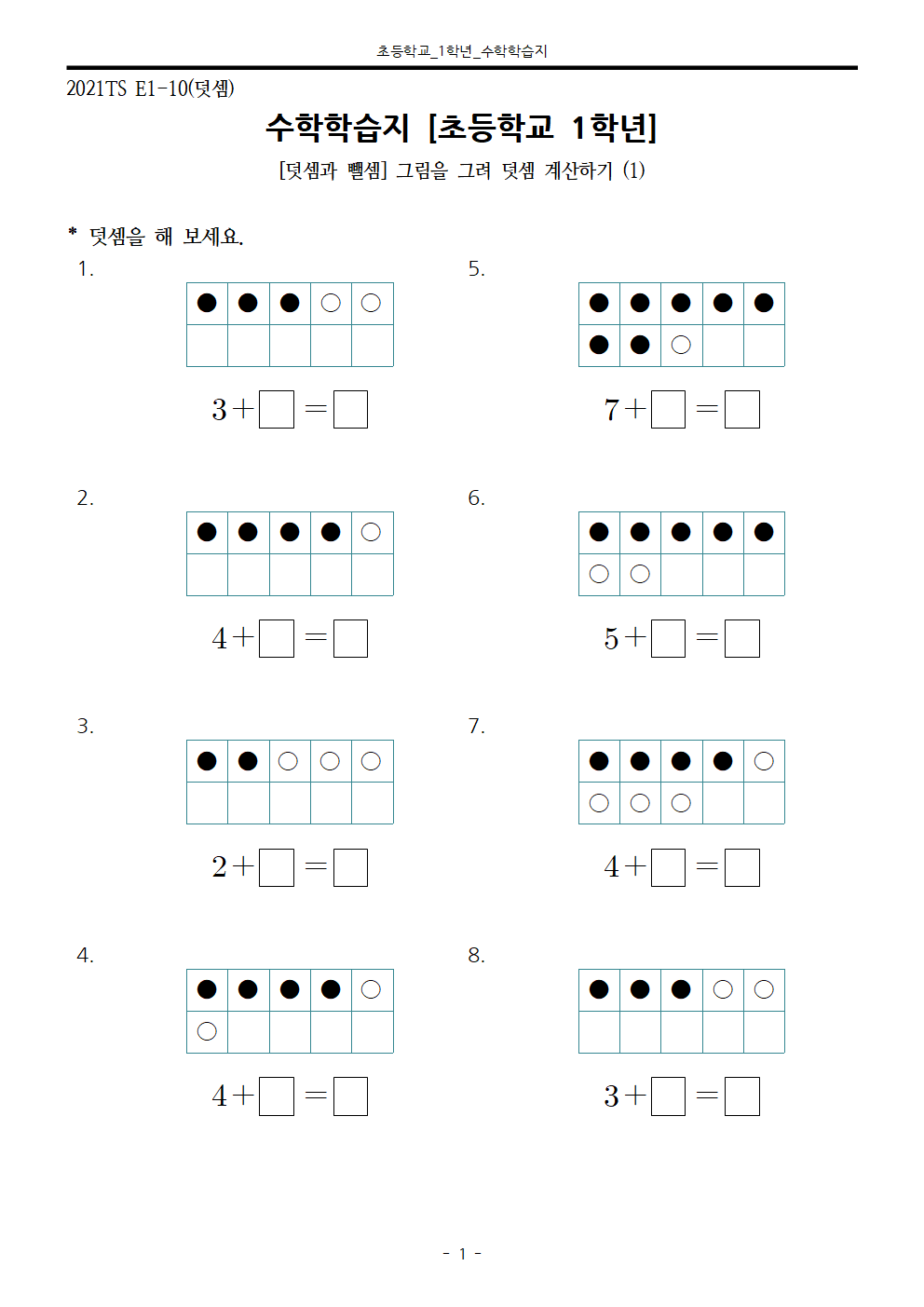 #태그 : 초1, 초등학교1학년, 덧셈과 뺄셈, 덧셈 학습지, 초등학교 1학년 덧셈, 학습지제작소
