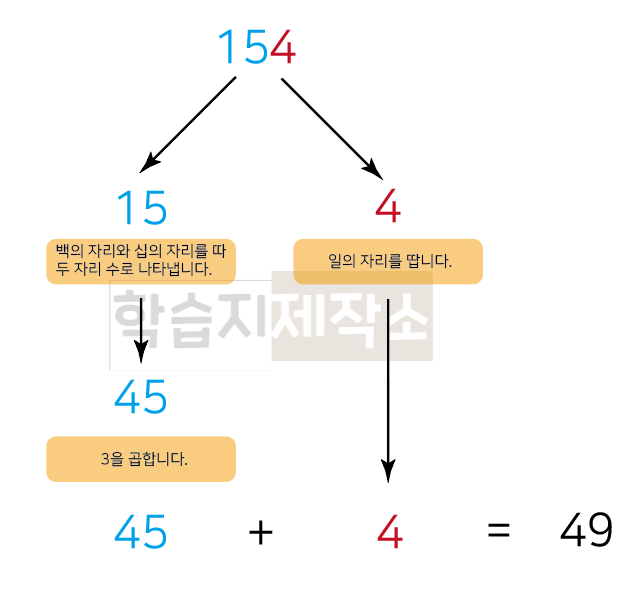 일의 자리와 앞의 자리를 갈라봅시다.예를 들어 154는 15와 4로 갈라서 생각해볼 수 있습니다.이때 15를 a, 4를 b라고 생각해봅시다.