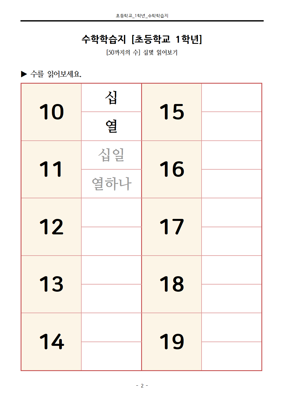 이번 글에서는 십몇을 다루어보았습니다. 10보다 큰 수를 세고, 읽고, 써보면서 수에 대한 감각을 익히는 차시입니다. 특히 모으기와 가르기는 연습을 통해 수의 크기를 대략 이해할 수 있도록 도와주세요. 다음 시간에는 50까지의 수를 세고, 쓰고, 읽어보는 활동지로 찾아뵙겠습니다.