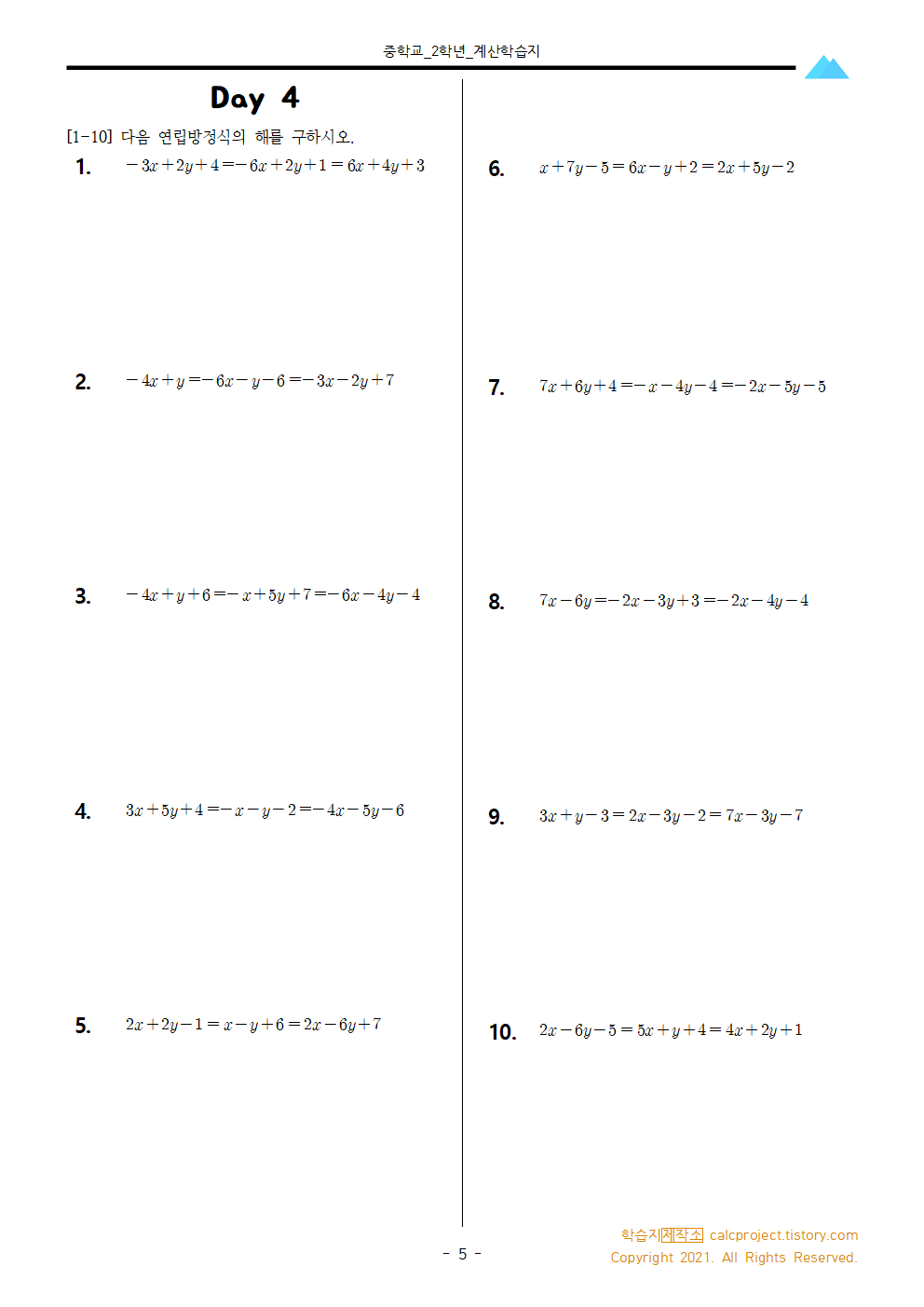 #태그 : 중2, 연립방정식 완전정복, 계수가 정수인 연립방정식, A=B=C꼴인 연립방정식, 두 개의 등호가 들어간 연립방정식 푸는 법, 학습지제작소