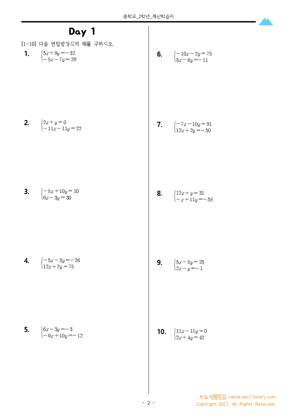 | [중2-1] 연립일차방정식(연립방정식) 단원 종합 계산학습지 75문제 (2) | 2021.05.10 |