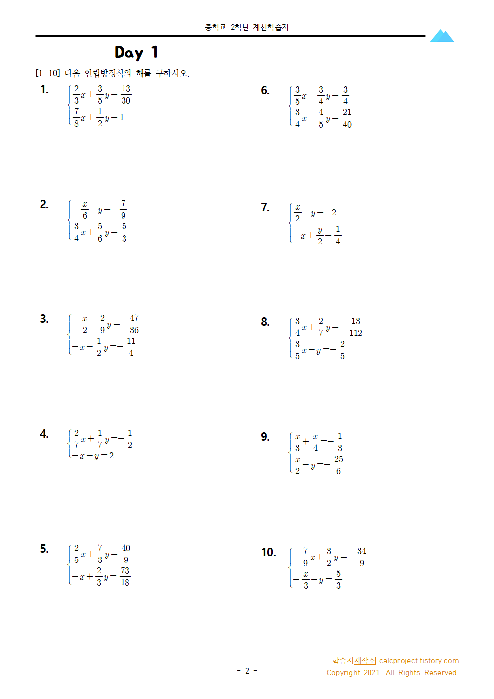 #태그 : 중2, 연립방정식 완전정복, 계수가 분수인 연립방정식 학습지, 분수 연립방정식 문제, 분수 연립방정식 수학학습지 다운, 다운로드, 중2내신, 학습지제작소