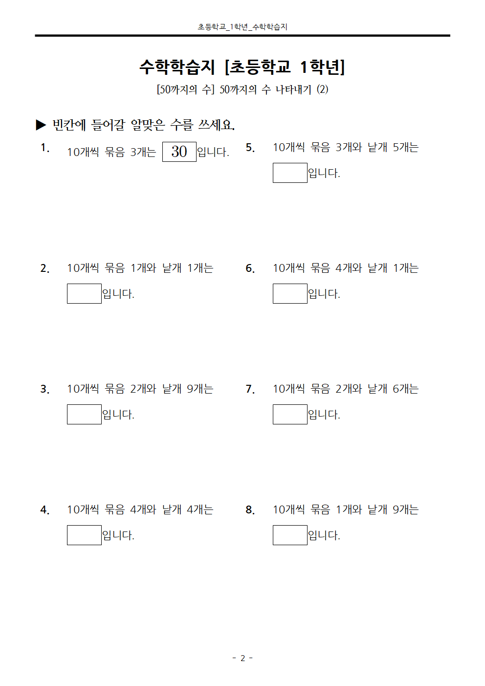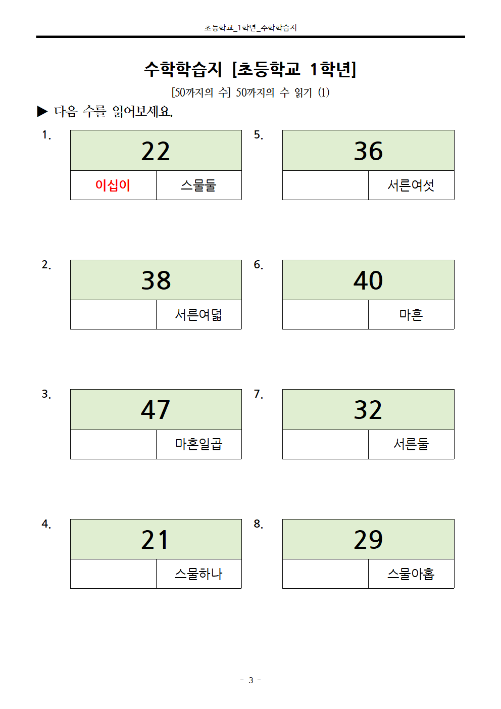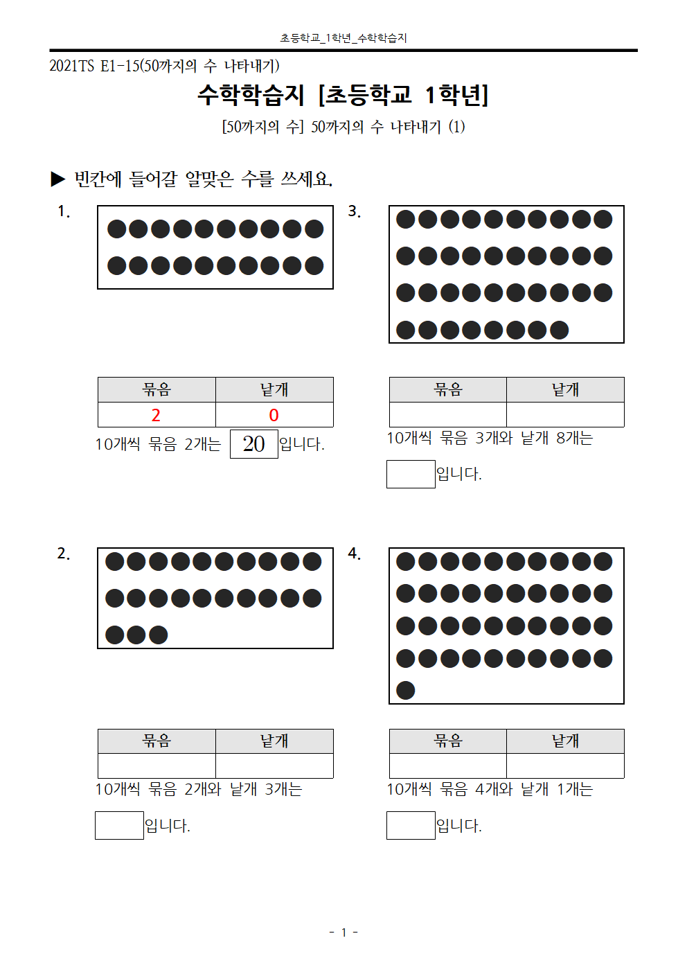 #태그 : 50까지의 수 나타내기, 50까지의 수 읽기 학습지, 초1, 초등학교 1학년, 학습지제작소