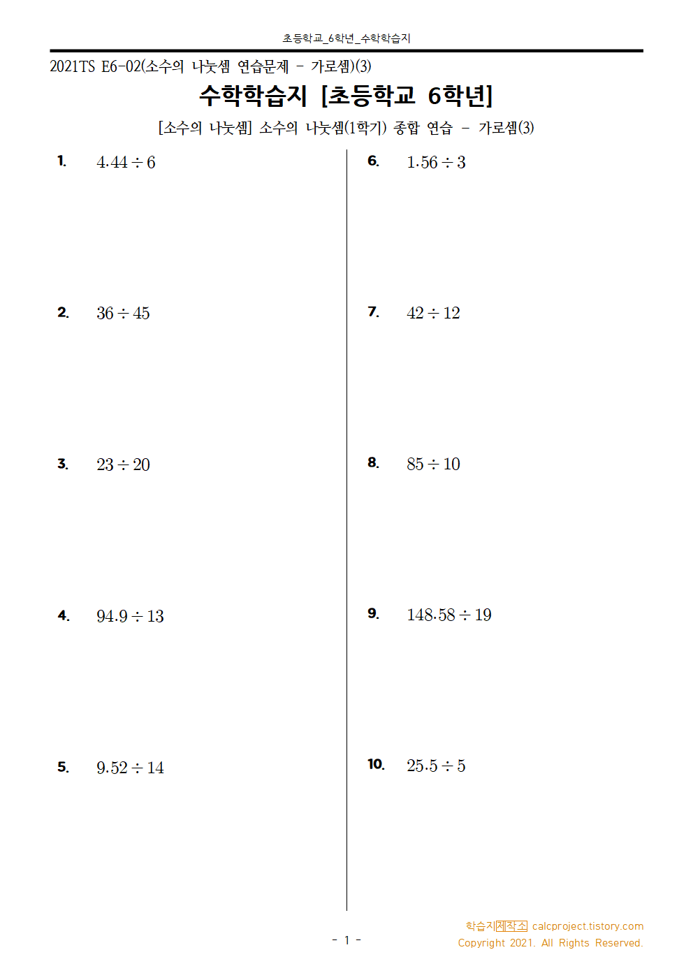 이 자료는 2020년 6학년 1학기 소수의 나눗셈 가로셈 학습지를 재구성한 자료입니다.