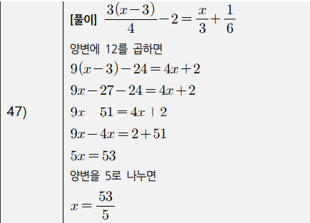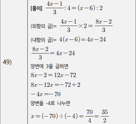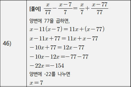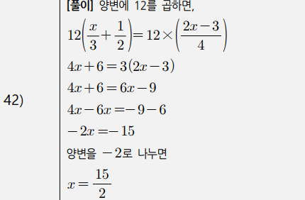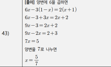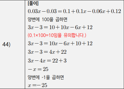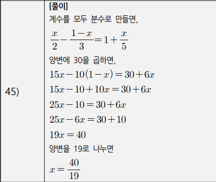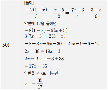 3) 복잡한 일차방정식(계수가 분수인 경우, 소수인 경우, 비례식) (41번~50번)