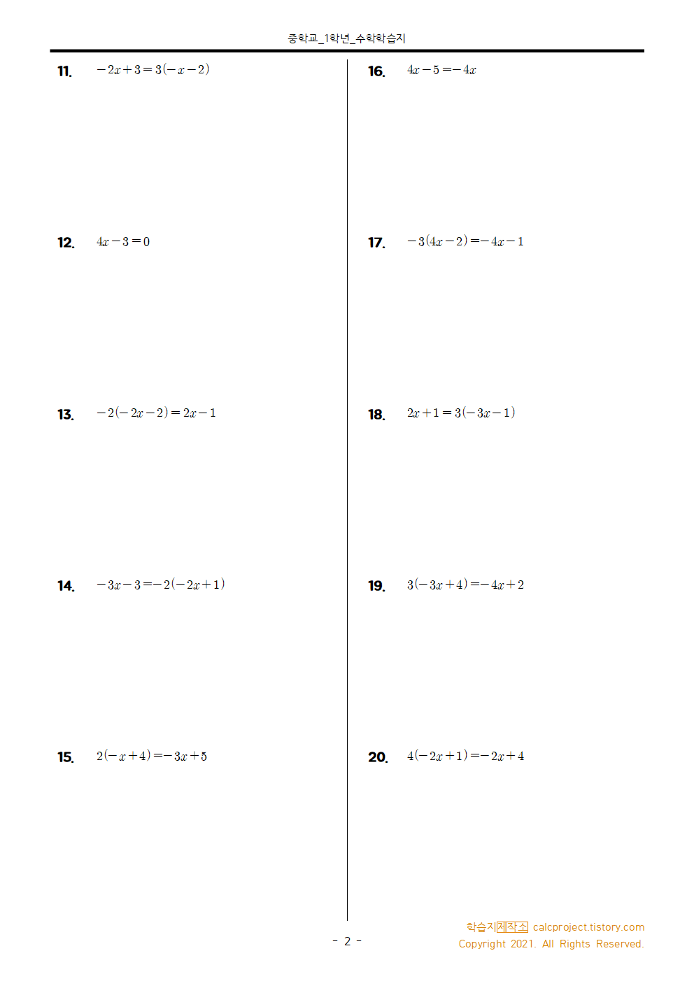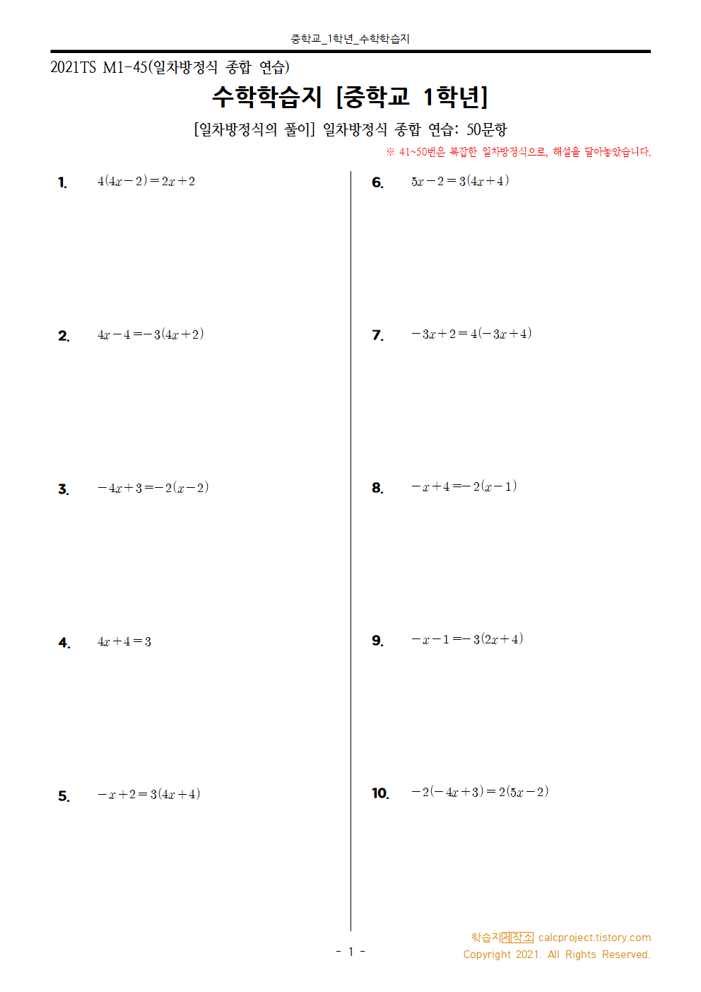 #태그 : 중1, 중학교 1학년, 계산학습지, 일차방정식의 풀이, 학습지제작소