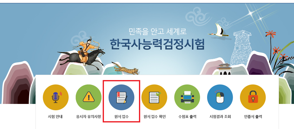 한국사능력검정시험 공식 홈페이지 중단부의 '원서 접수'를 통해 시험 응시가 가능합니다. 원서 접수일에만 이용가능하니, 참고하시길 바랍니다.