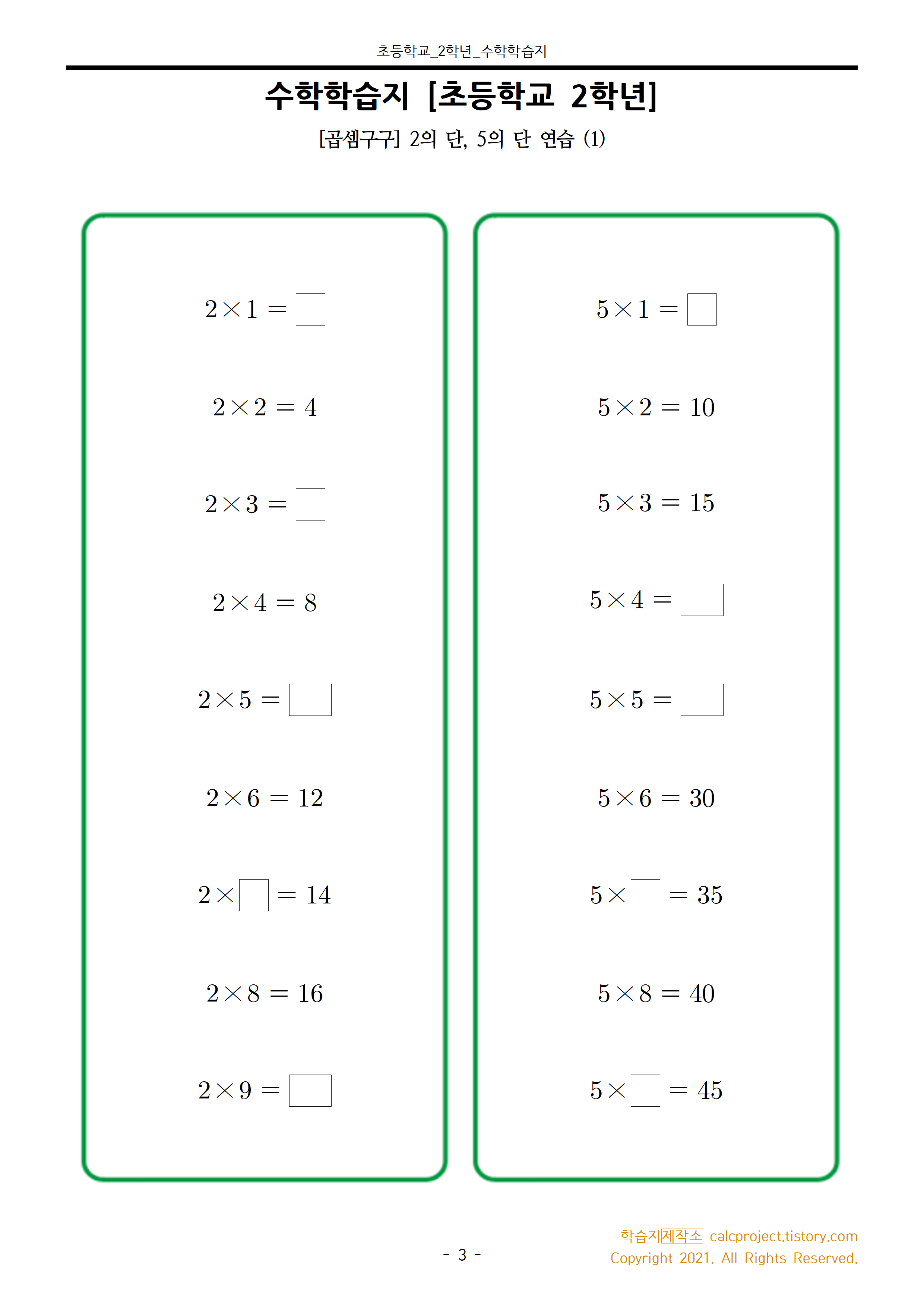 #태그 : 초2, 초등학교 2학년, 곱셈구구, 2의 단 곱셈구구, 5의 단 곱셈구구, 2단 곱셈 학습지, 5단 곱셈구구학습지, 2단 구구단학습지, 5단 구구단 학습지, 수학학습지, 학습지제작소