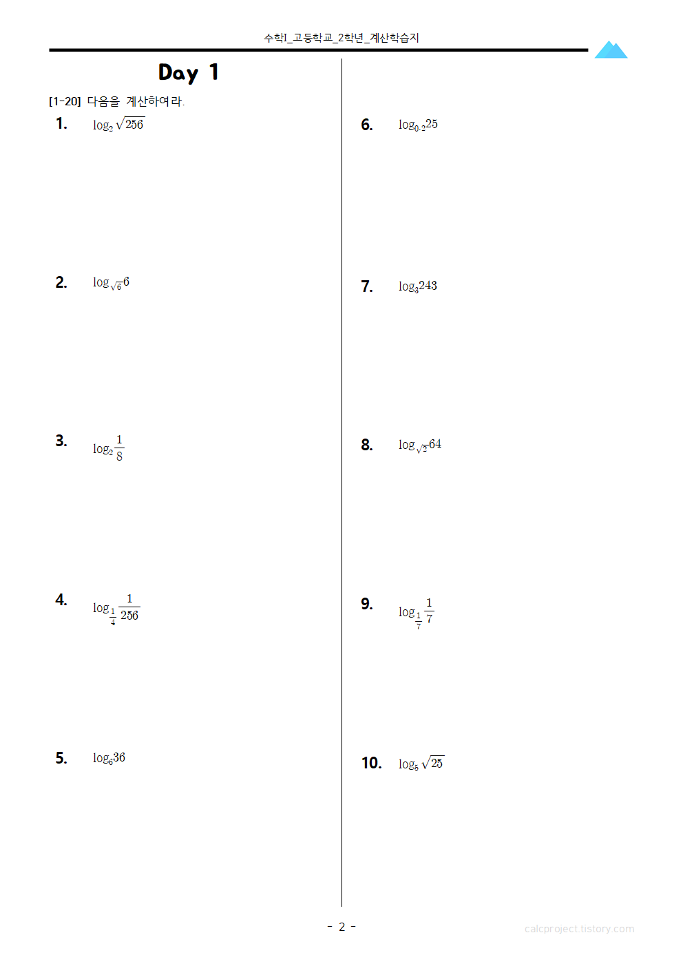 #태그 : 지수함수와 로그함수, 수학 I, 지수, 로그, 로그의 의미, 로그 개념, 로그 개념설명, 로그 연습문제, 로그 연산문제, 다운, 다운로드, 학습지, 로그 학습지, 고2 수학문제, 고2 학습지, 학습지제작소