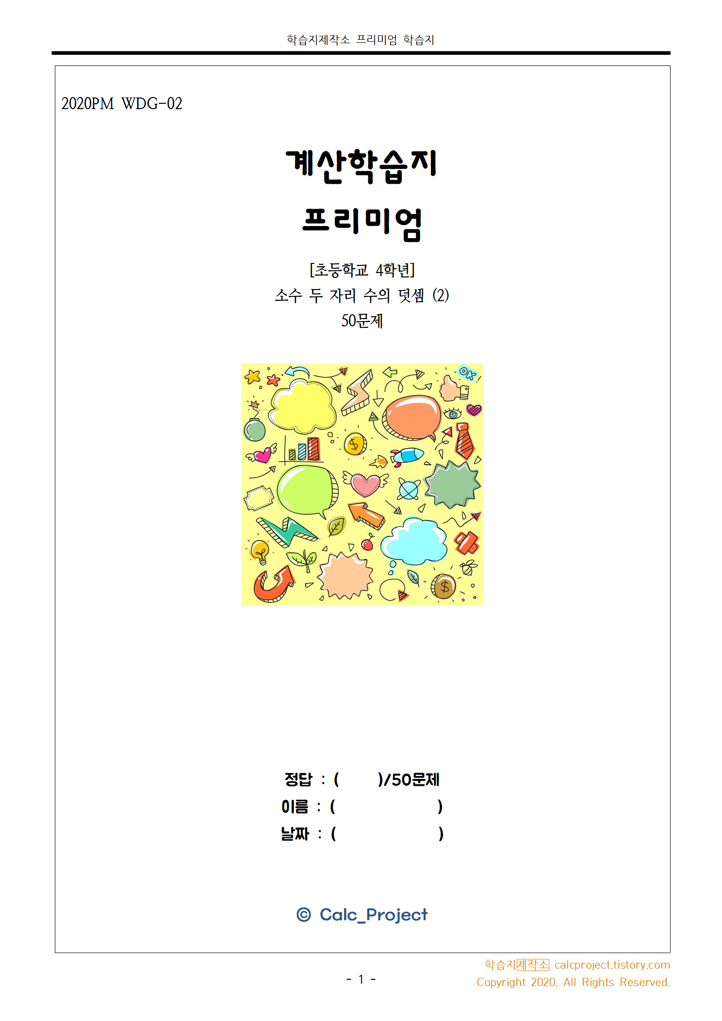 4학년 2학기 3단원 '소수의 덧셈과 뺄셈' 중 소수 두 자리 수의 덧셈 계산 연습을 위한 학습지입니다. 모두 50문항이며, 자세한 개념 설명은 소수 두 자리 수의 덧셈을 참고하시길 바랍니다.