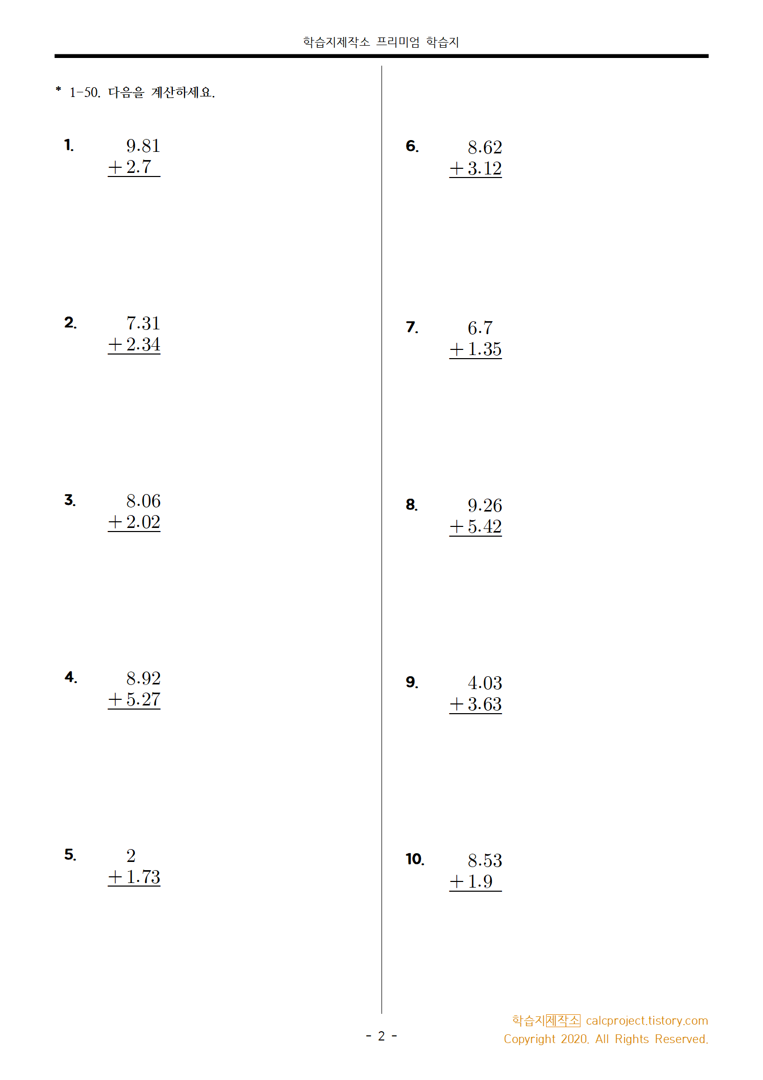 자연수와 소수 두 자리 수의 덧셈소수 한 자리 수와 소수 두 자리 수의 덧셈 문항도 섞었습니다.