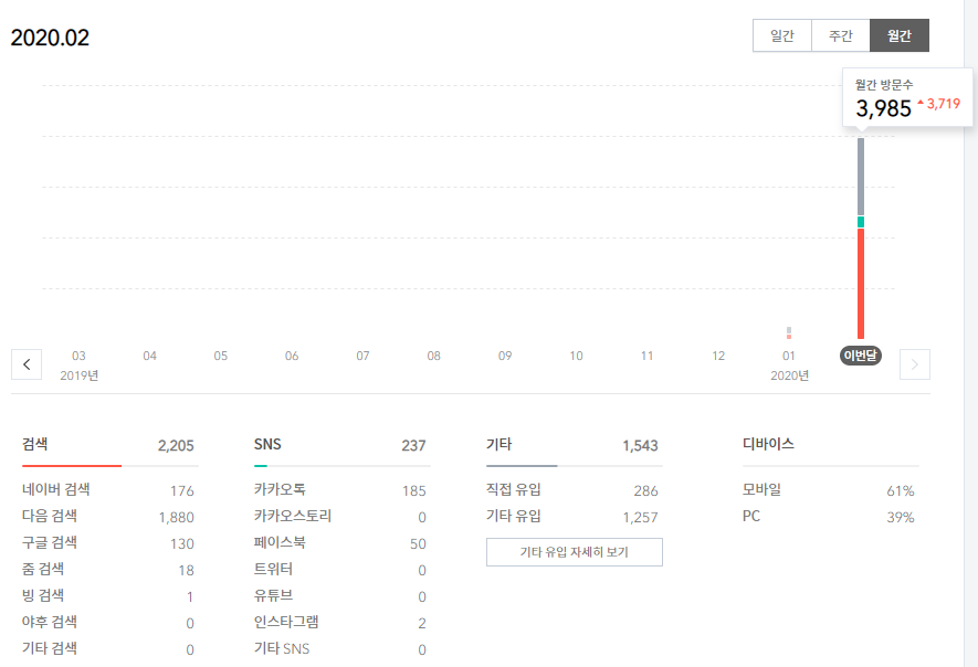 검색 유입량 2205회 중 1880회를 기록했으니, 검색 플랫폼 중 약 85%를 차지했네요. 2000번 넘는 검색이라니, 초보 블로거에게는 굉장히 의미있는 숫자인 것 같습니다.
