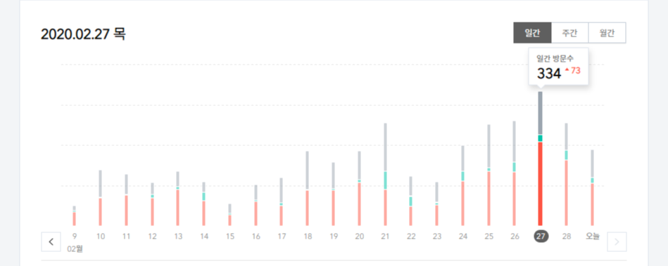 일일 방문수는 18명에서 시작하여 2월 27일 최대 334명을 찍었습니다. 일일 방문수가 300명이 넘었으면 좋겠다고 생각했는데, 이루어져서 뭔가 성취감을 느꼈습니다.