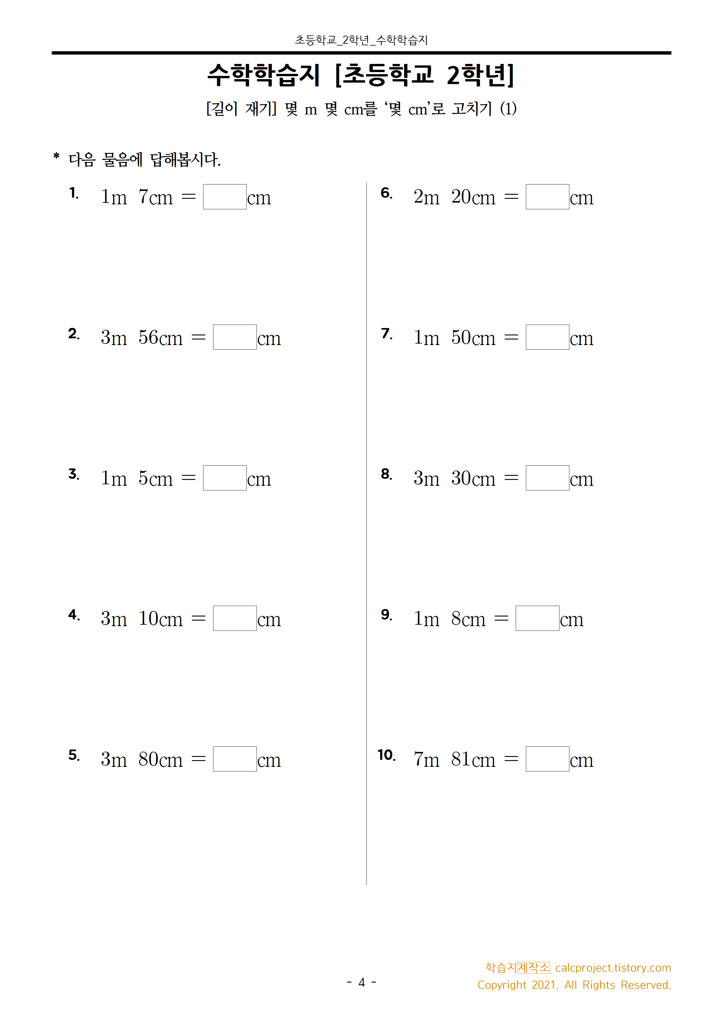 1) '몇m 몇cm'를 '몇 cm'로 나타내기