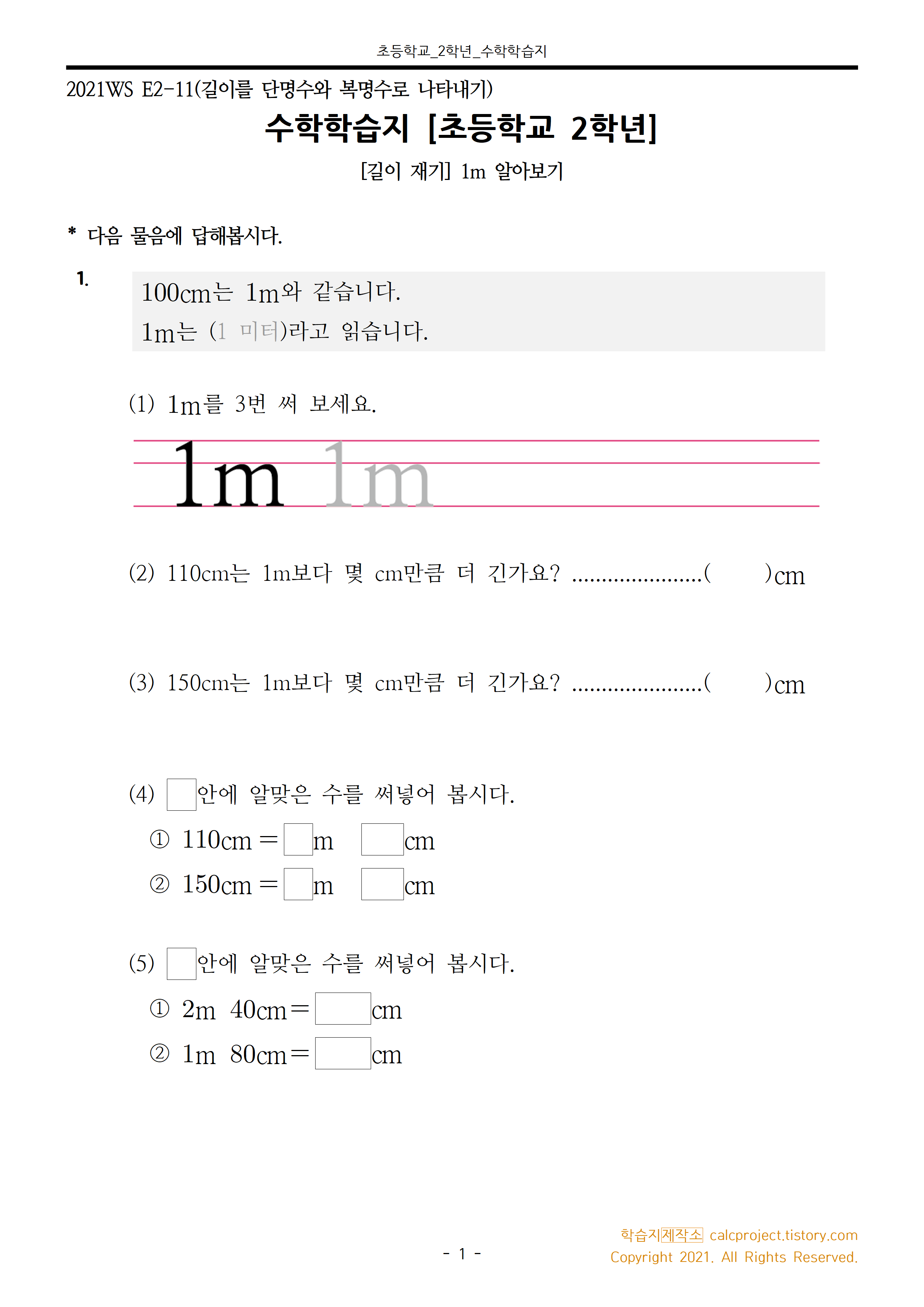 이번 학습지는 1m의 의미를 이해하고 길이를 '몇 cm 몇 m'나 '몇 cm'로 나타내어보는 활동으로 구성했습니다. 단위를 변환해보면서 길이를 여러 가지 방법으로 나타내어보는 연습을 할 수 있을 것입니다.