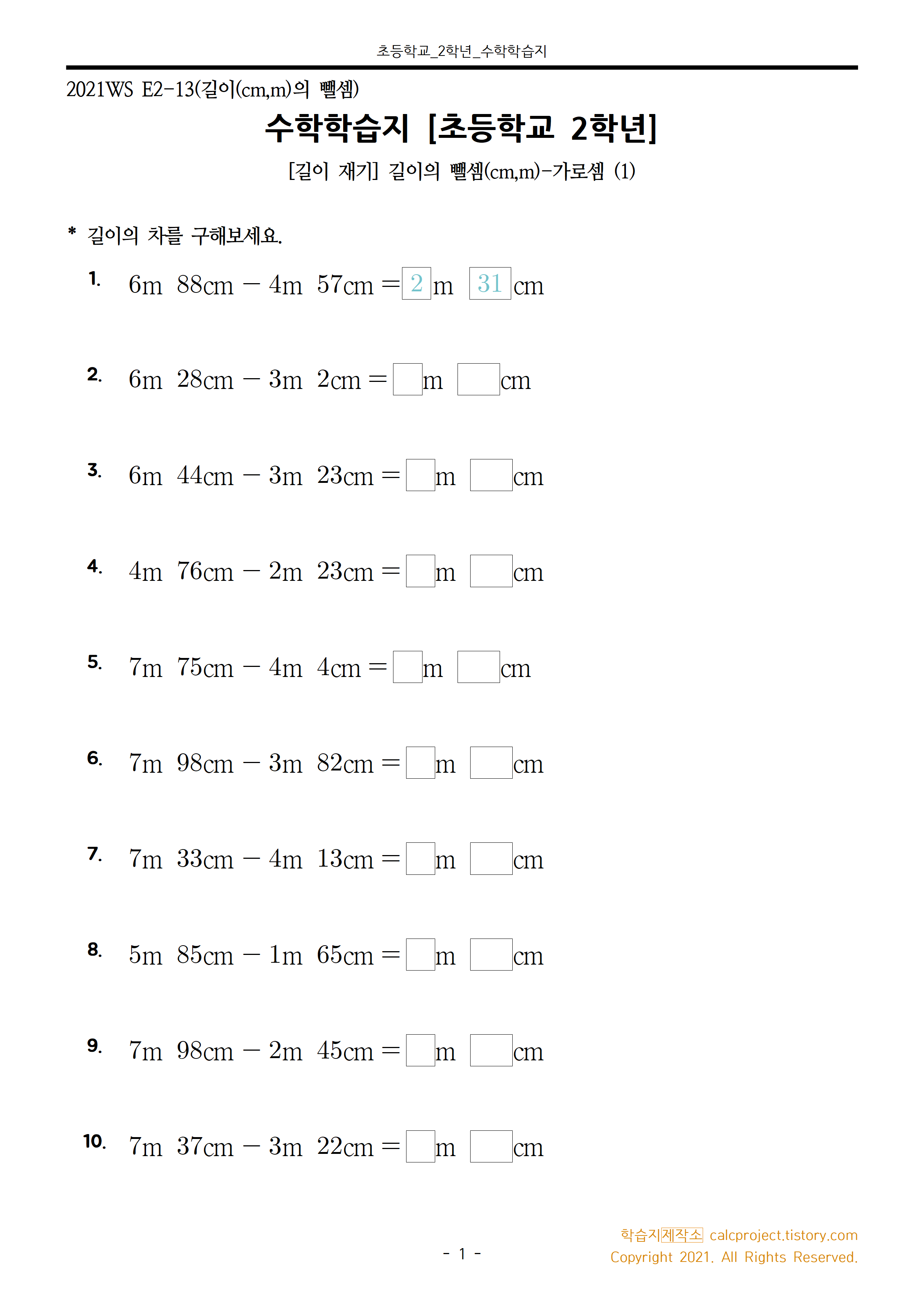 #태그 : 길이재기, 길이의 뺄셈, 학습지, 초2, 초등학교 2학년, 학습지제작소