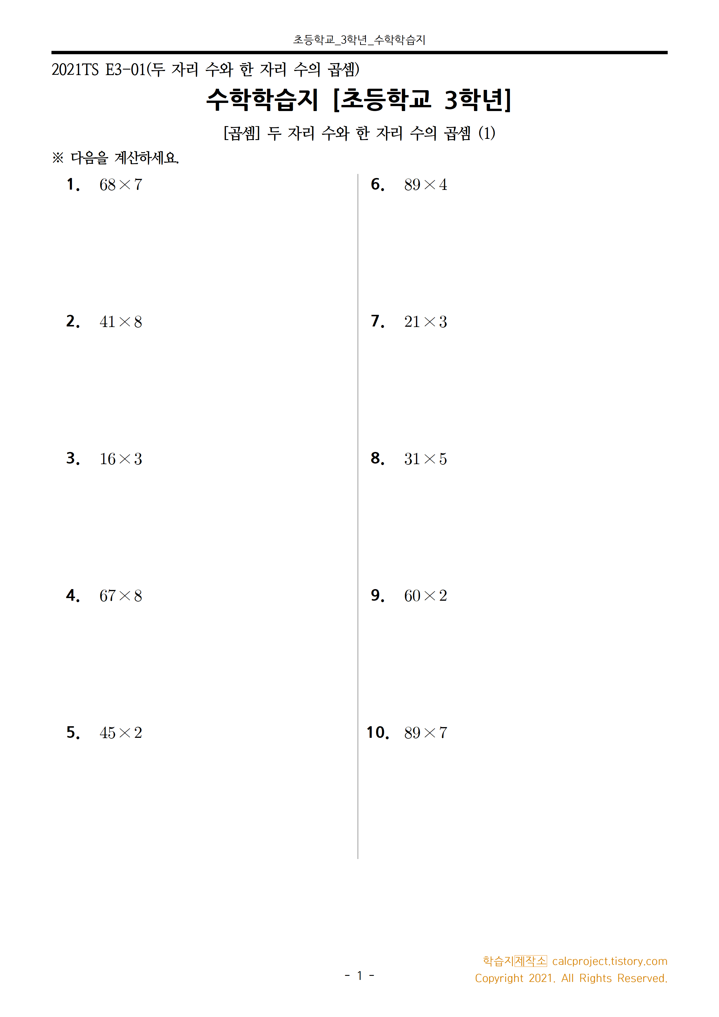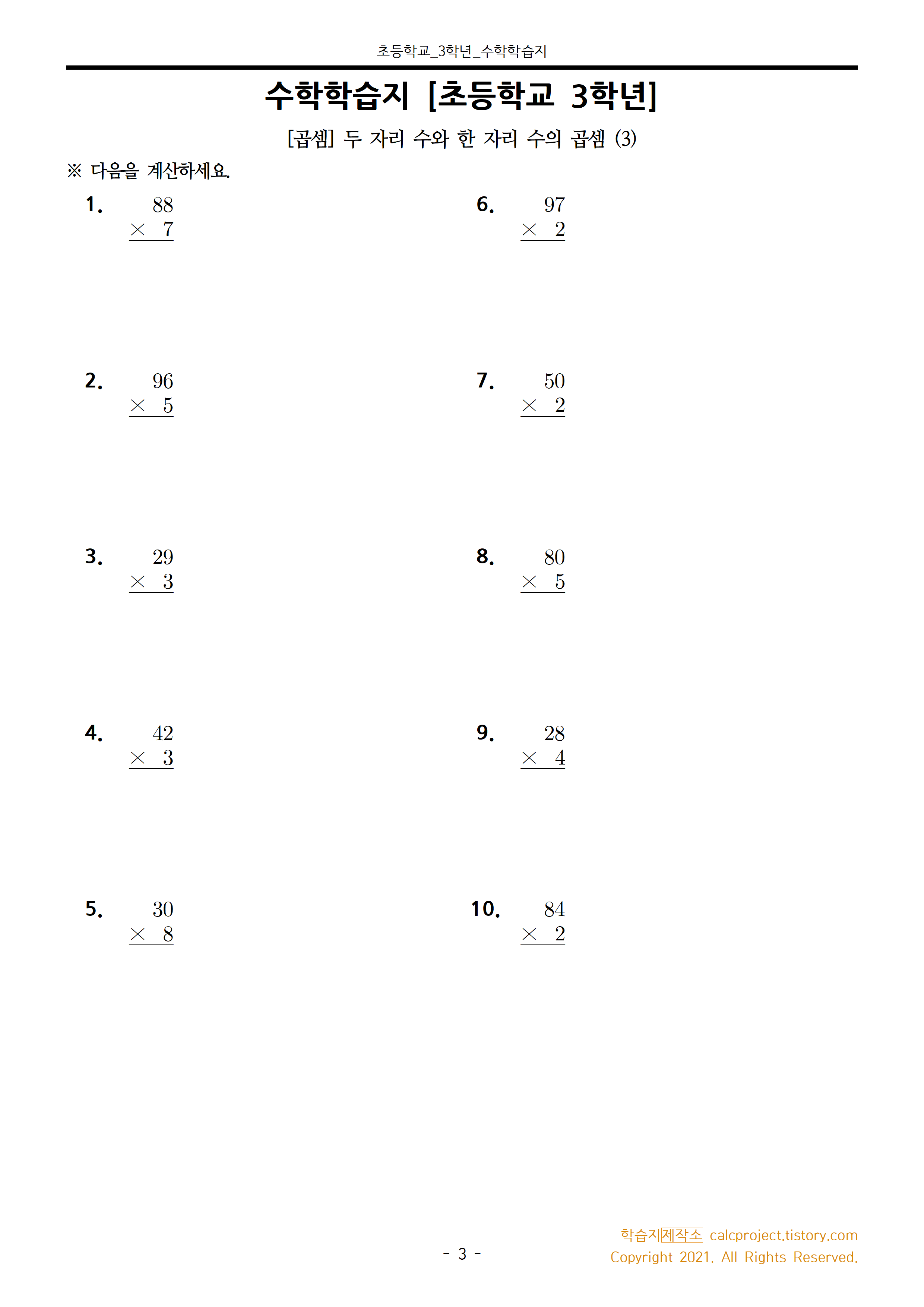 #태그 : 초3, 초등학교 3학년, 곱셈, 두 자리 수와 한 자리 수의 곱셈, 두 자리 수 곱하기 한 자리 수, 학습지제작소