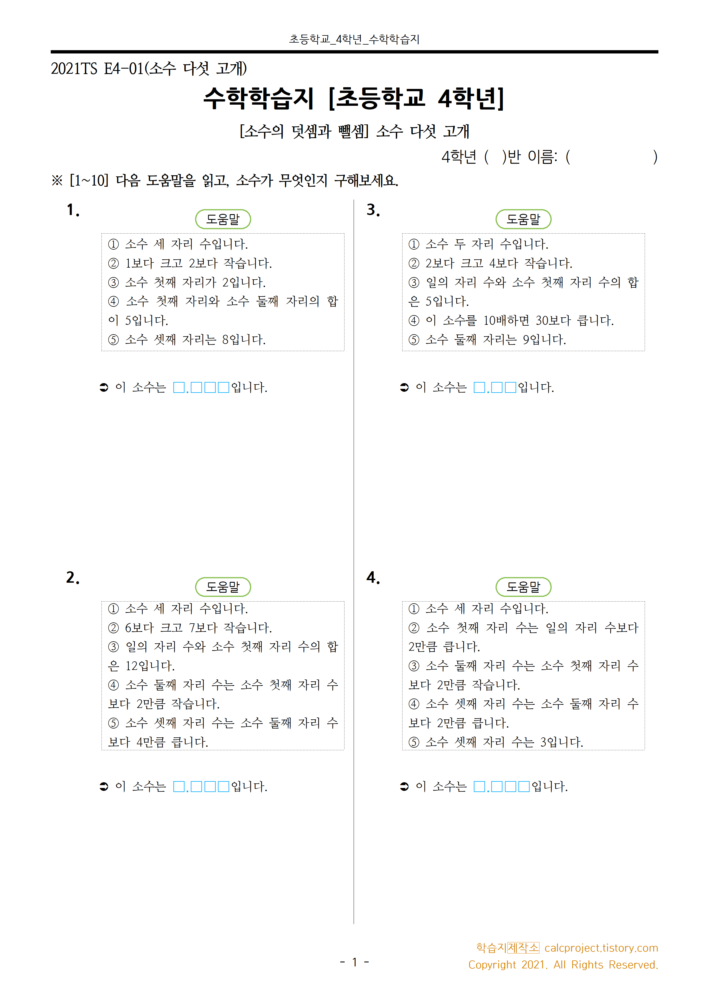 초등학교 4학년 2학기 - 소수의 덧셈과 뺄셈 기초 연산 학습지