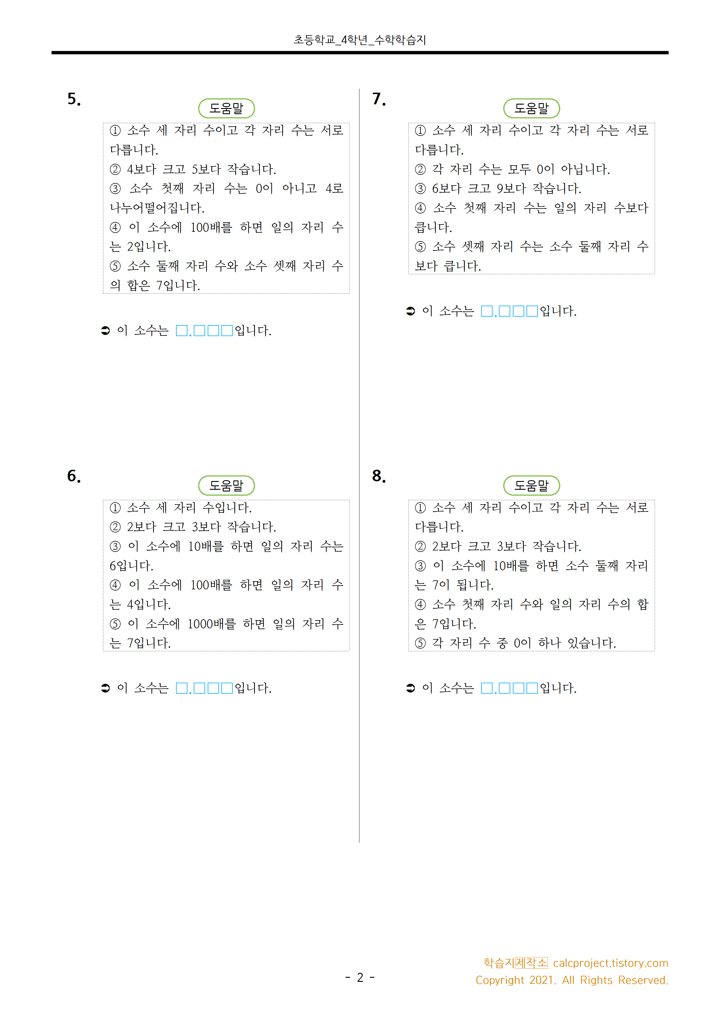 | [7] | <다섯 고개> ① 소수 세 자리 수이고 각 자리 수는 서로 다른 짝수입니다. ② 각 자리 수는 모두 0이 아닙니다. ③ 6보다 크고 9보다 작습니다. ④ 소수 첫째 자리 수는 일의 자리 수보다 큽니다. ⑤ 소수 셋째 자리 수는 소수 둘째 자리 수보다 큽니다. |