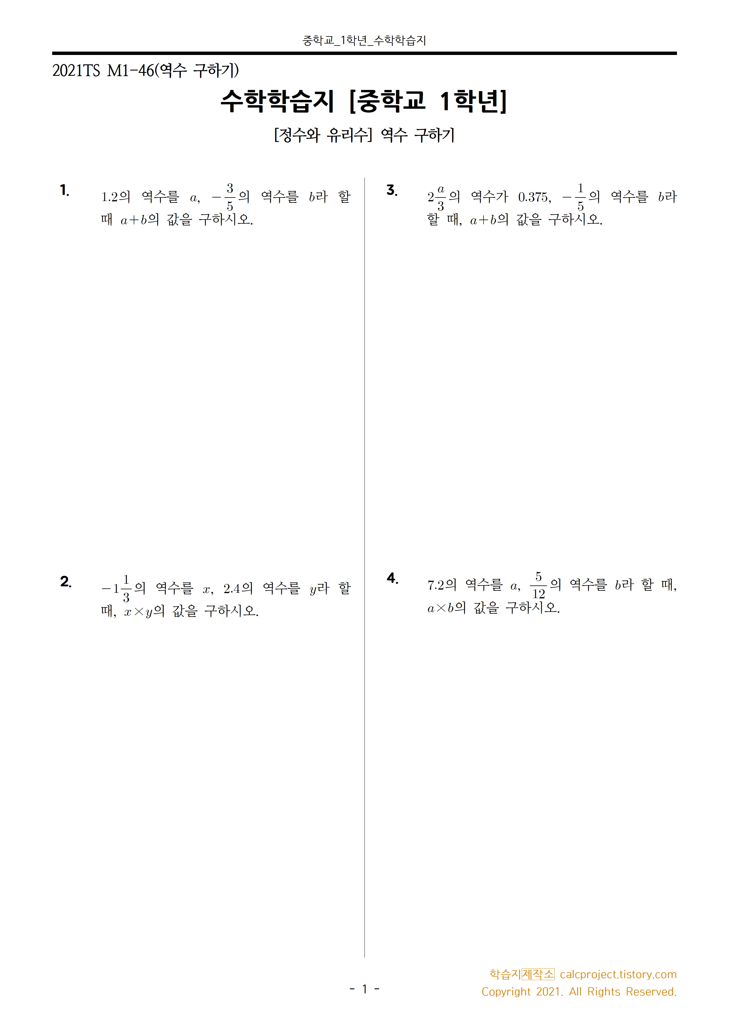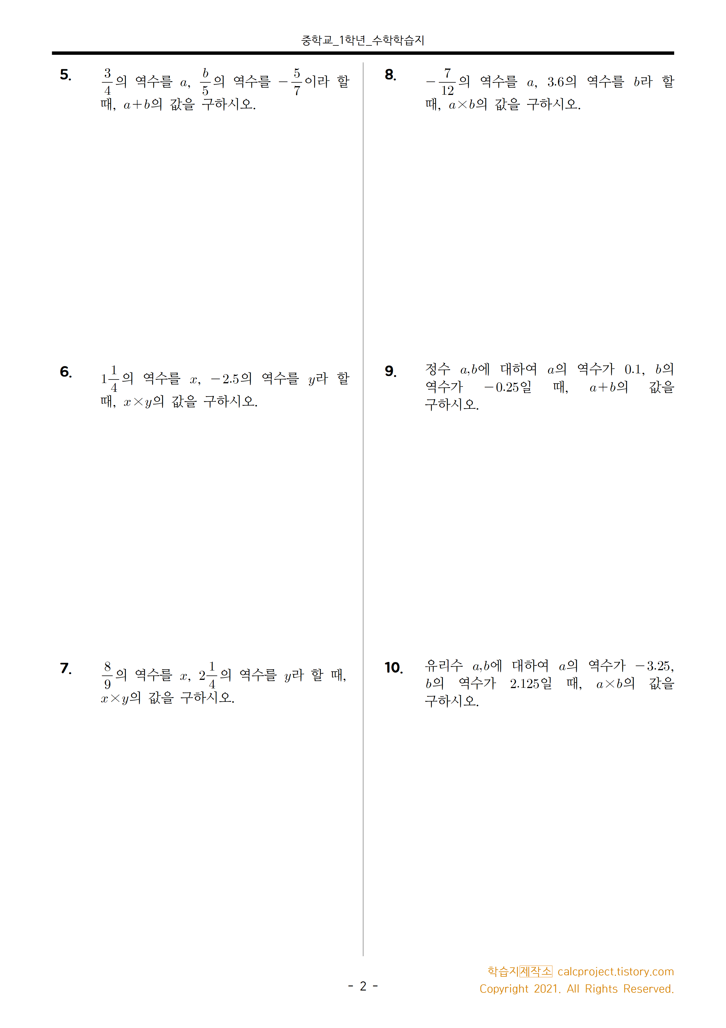 #태그 : 정수와 유리수의 계산, 역수, 역수의 뜻, 역수 계산 방법, 역수 구하기 학습지, 역수 수학문제, 다운, 다운로드, 중1, 학습지제작소