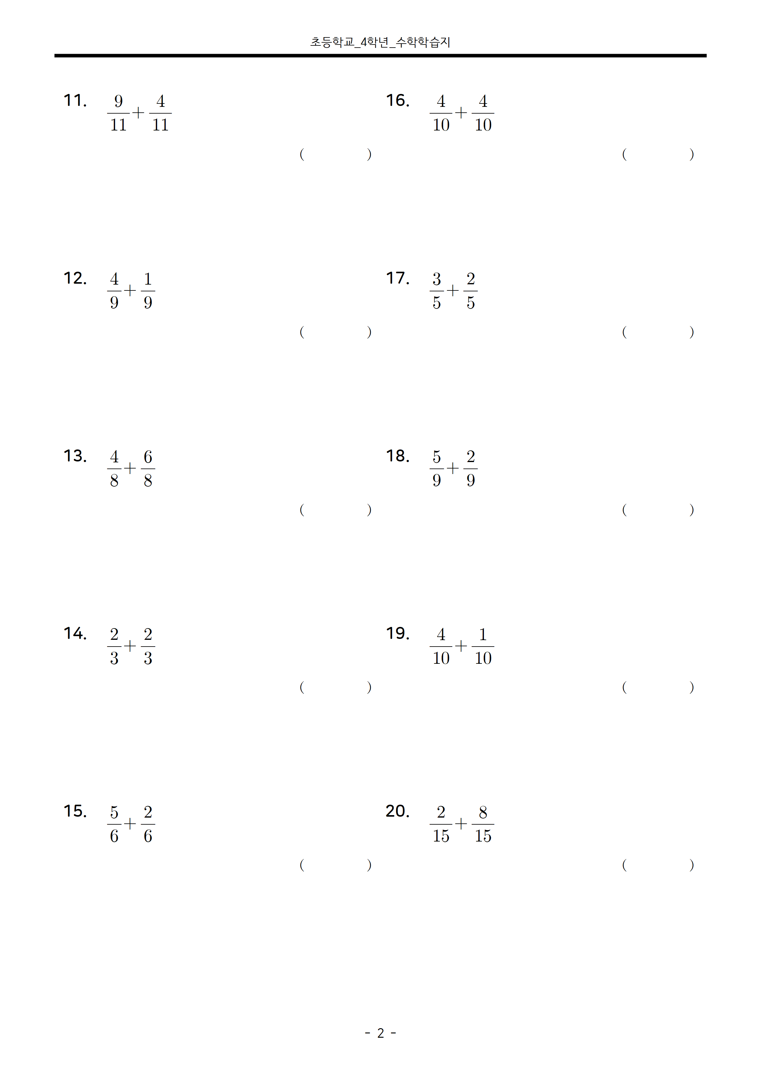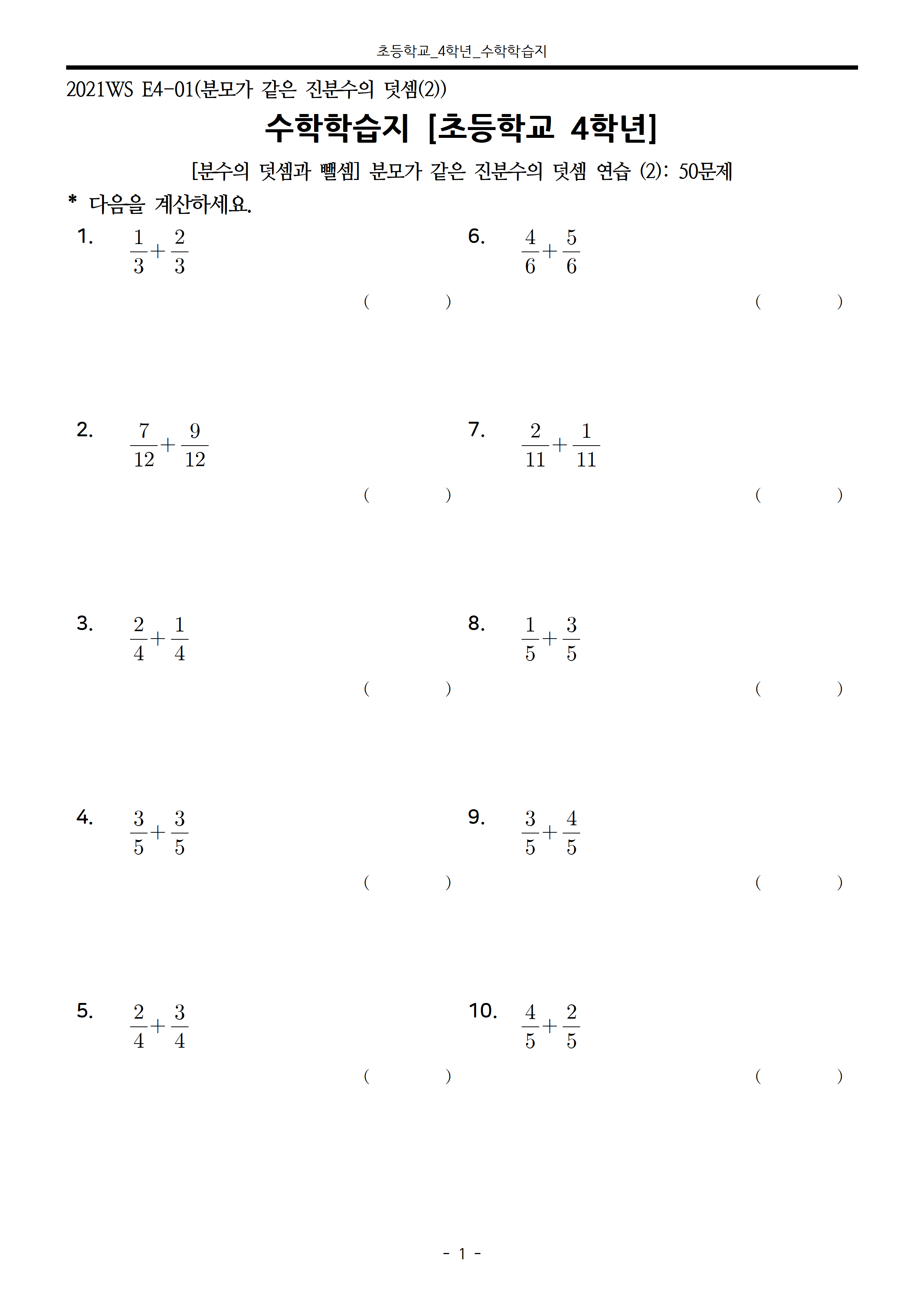 #태그 : 초4, 초등학교4학년, 분수의 덧셈과 뺄셈 학습지, 분모가 같은 두 진분수의 덧셈, (진분수)+(진분수), 분수의 덧셈 학습지