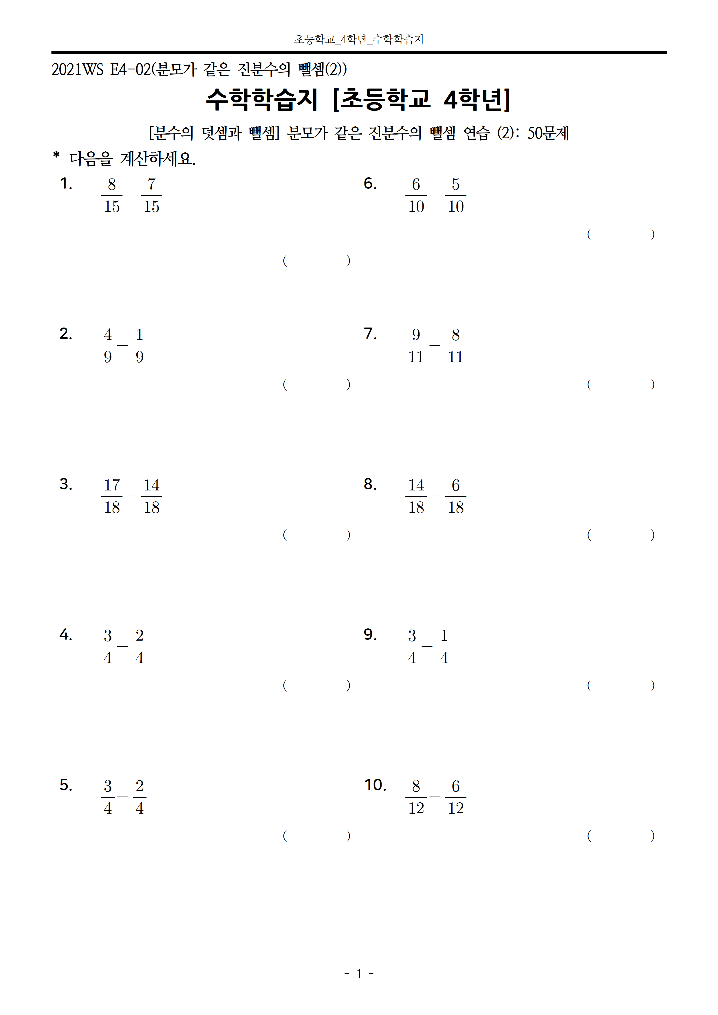 이번 글에서는 (진분수)-(진분수) 50문제 학습지를 다룹니다.