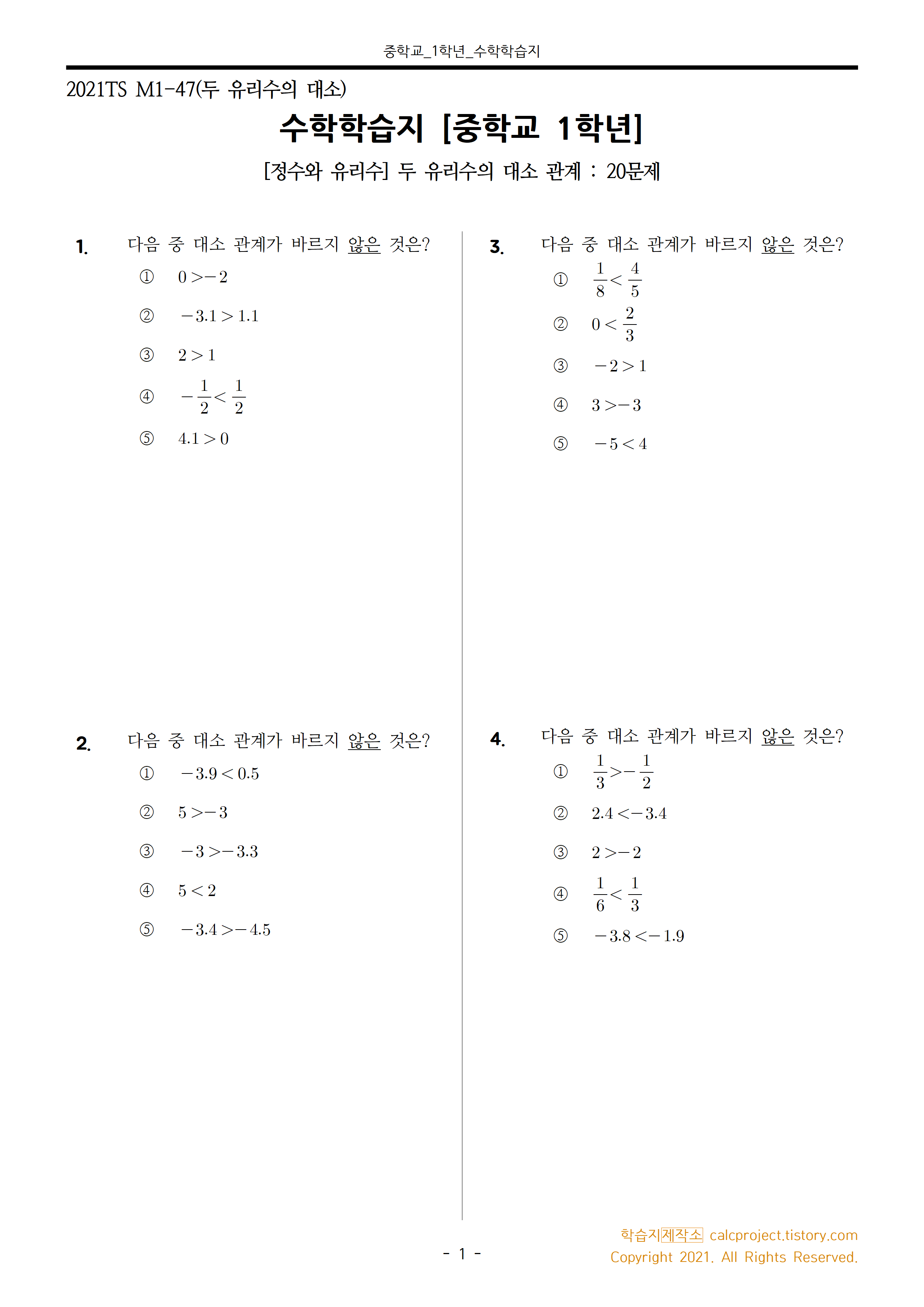#태그 : 중1, 중학교 1학년 수학, 유리수의 대소 관계, 유리수 대소 비교 문제
