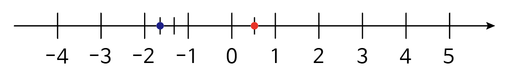 두 점을 찍었을 때 1/2가 -5/3보다 오른쪽에 있으므로 1/2가 더 큽니다.