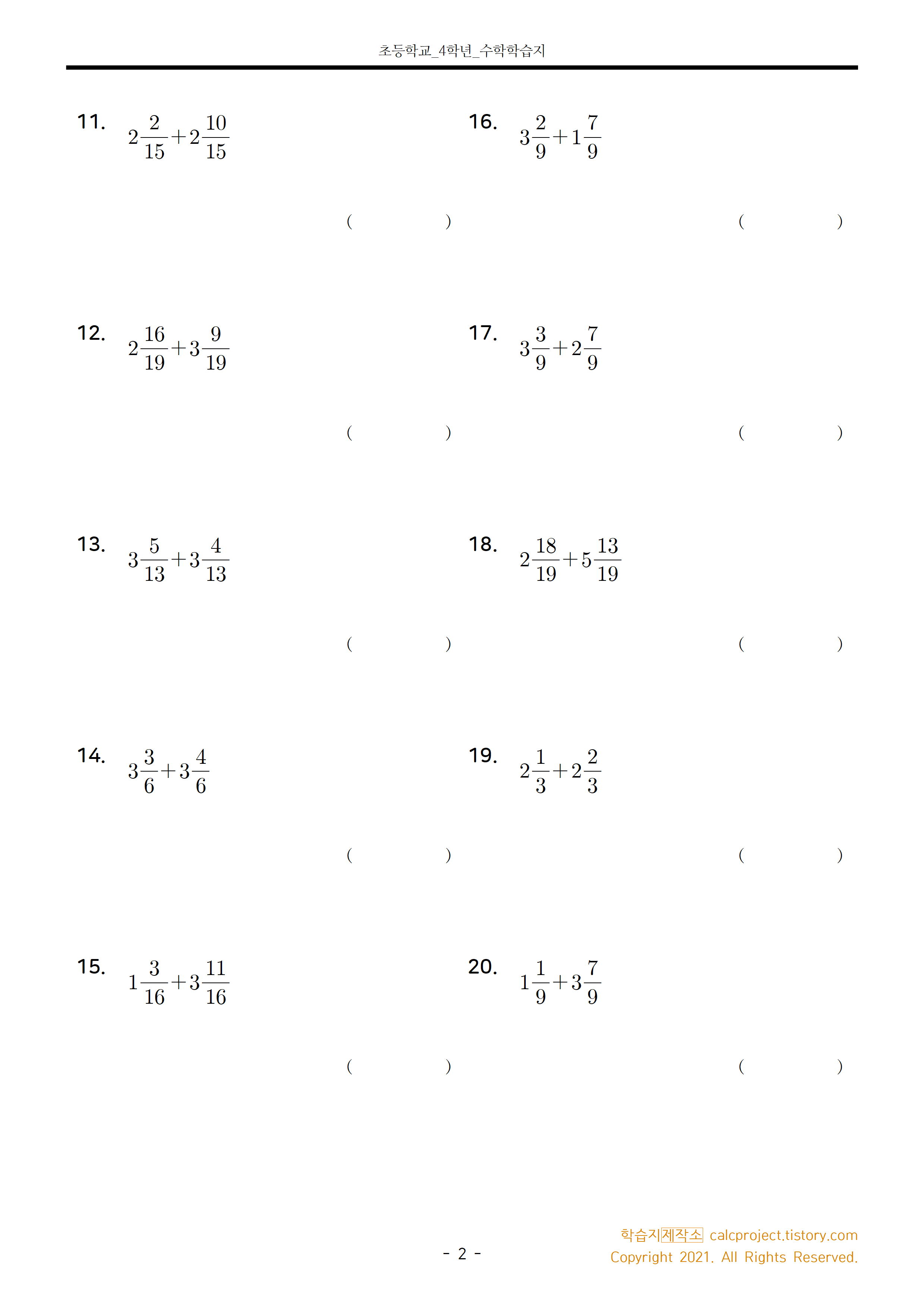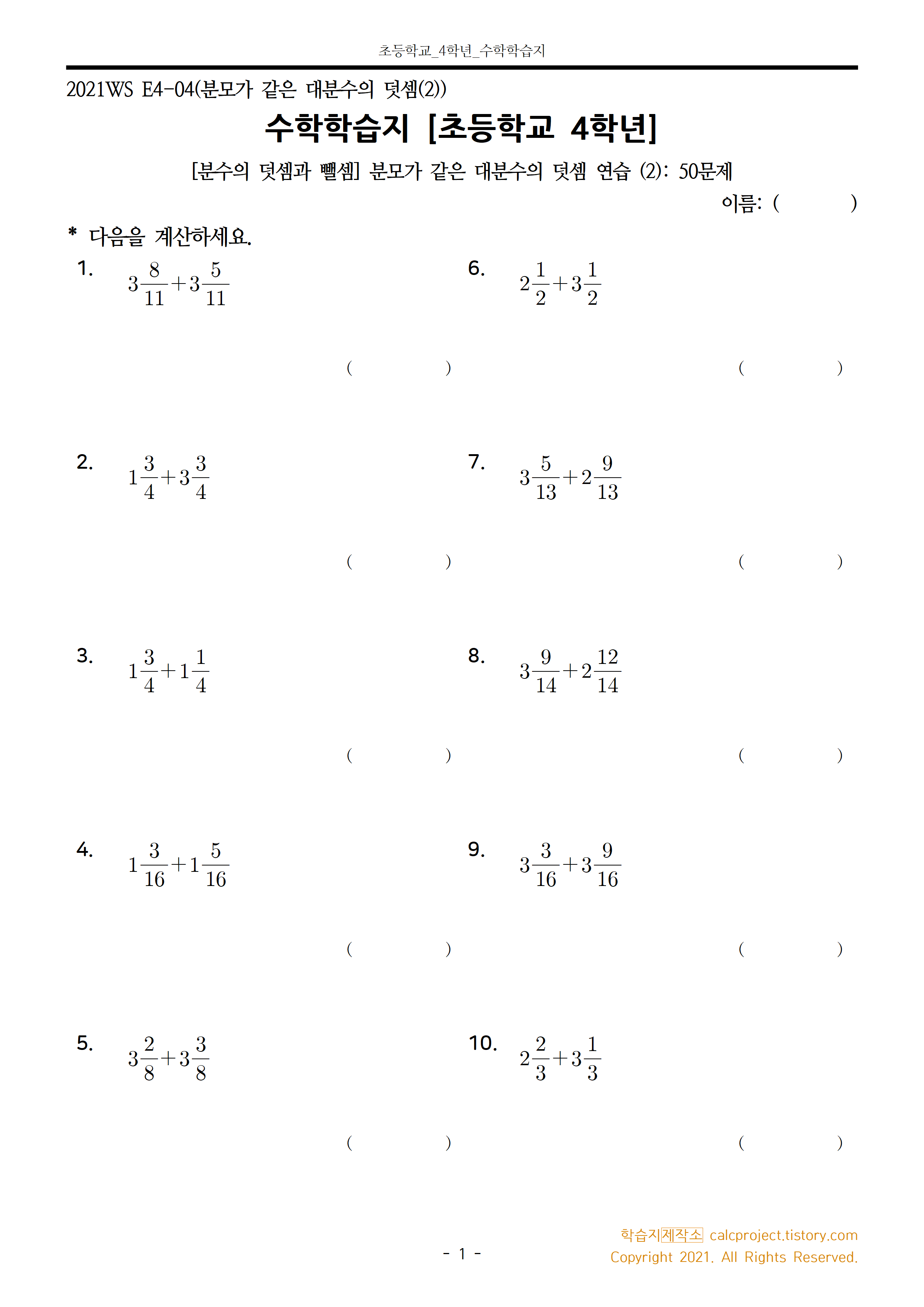 #태그 : 초4,초등학교4학년, 동분모분수의 덧셈, 분모가 같은 대분수의 덧셈, (대분수)+(대분수) 수학문제, 대분수수학학습지, 초등학교 대분수 덧셈 학습지, 학습지제작소
