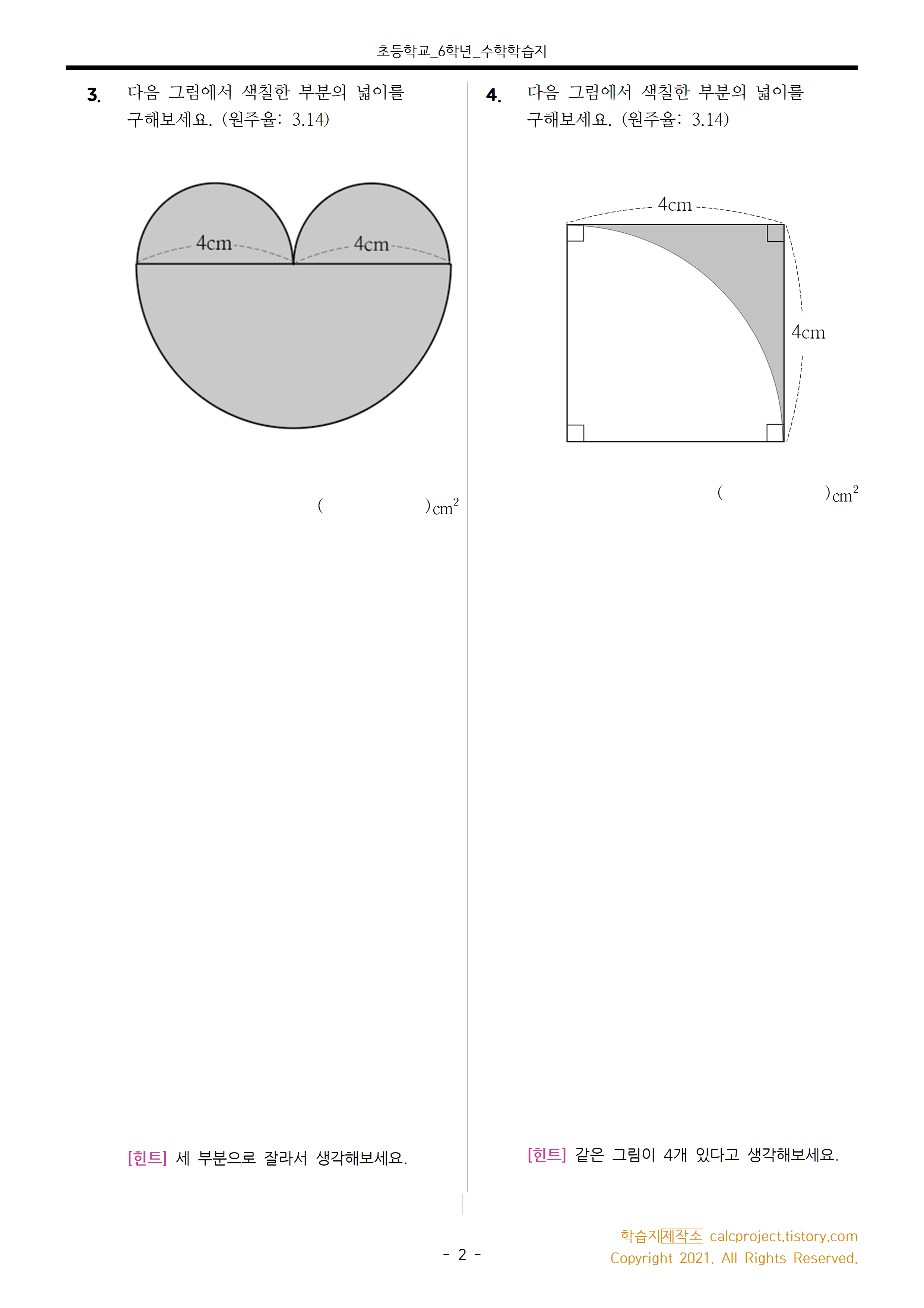 학습지제작소는 아래 보충학습지를 개발하여 원의 넓이를 구하는 문제를 제공하였습니다.