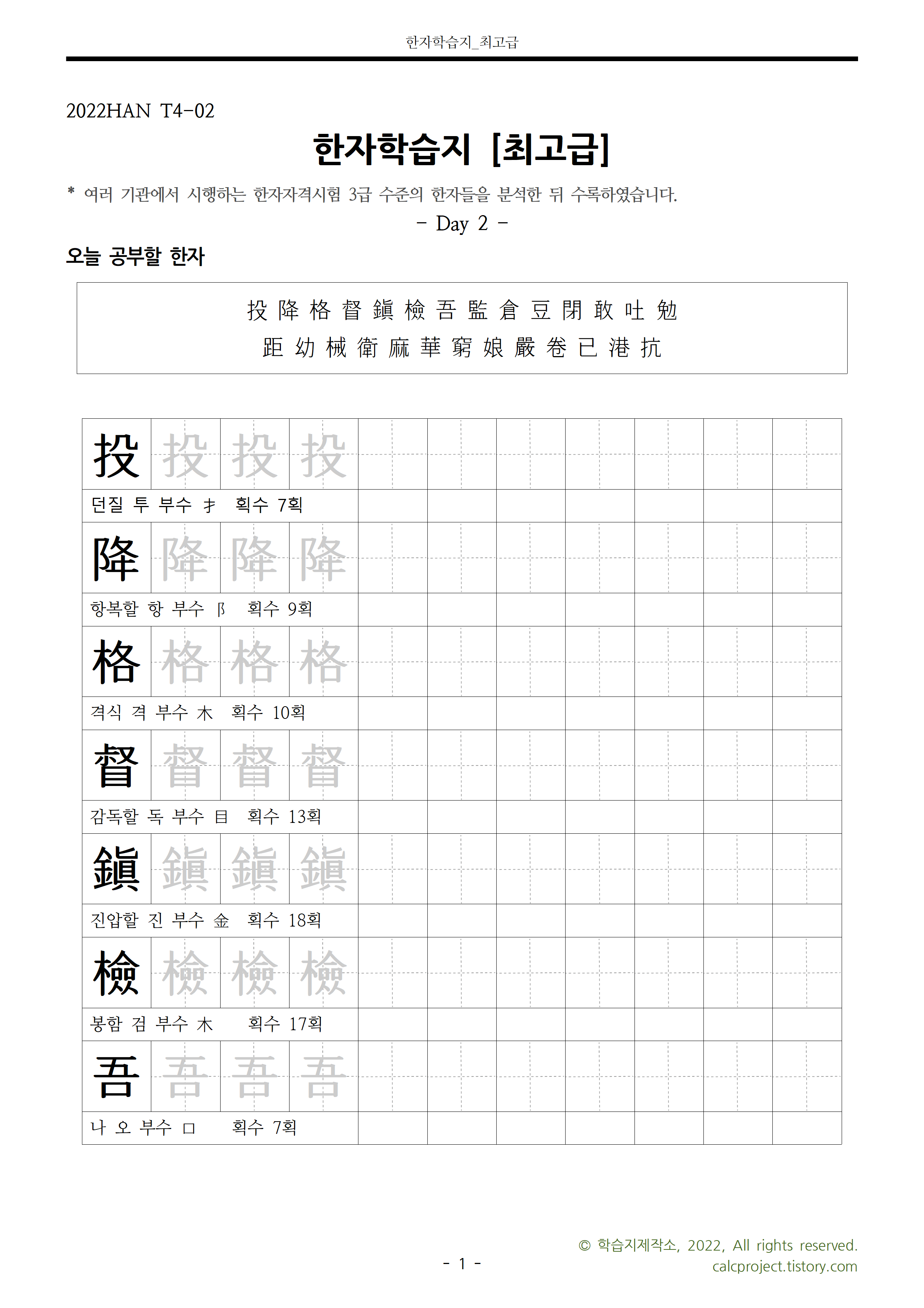 | [최고급] 한자학습지 Day 4 한자쓰기연습장 (1) | 2022.01.21 |