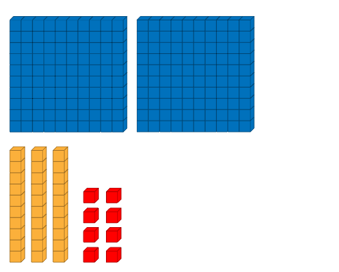 그림에서 백 모형은 2개, 십 모형은 3개, 일 모형은 8개입니다.