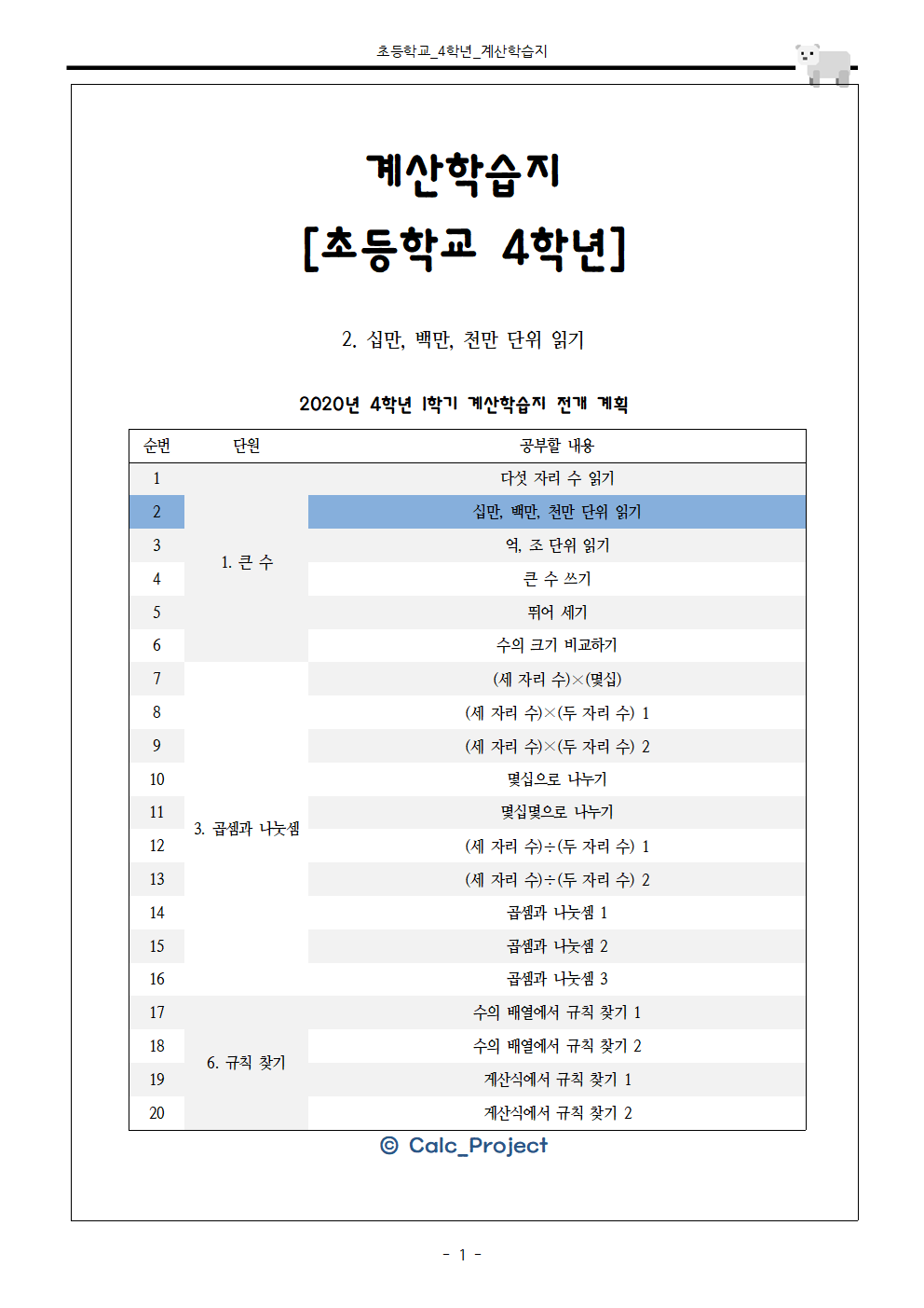 안녕하세요, 학습지제작소입니다. ※ 학습지 제작의 주안점 4학년 1단원은 큰 수로 10000이상의 자연수를 읽고 쓰며, 그 수에 대한 양감을 기르는 것을 목표로 하고 있습니다. 큰 수에 대한 양감은 큰 수의 비교..