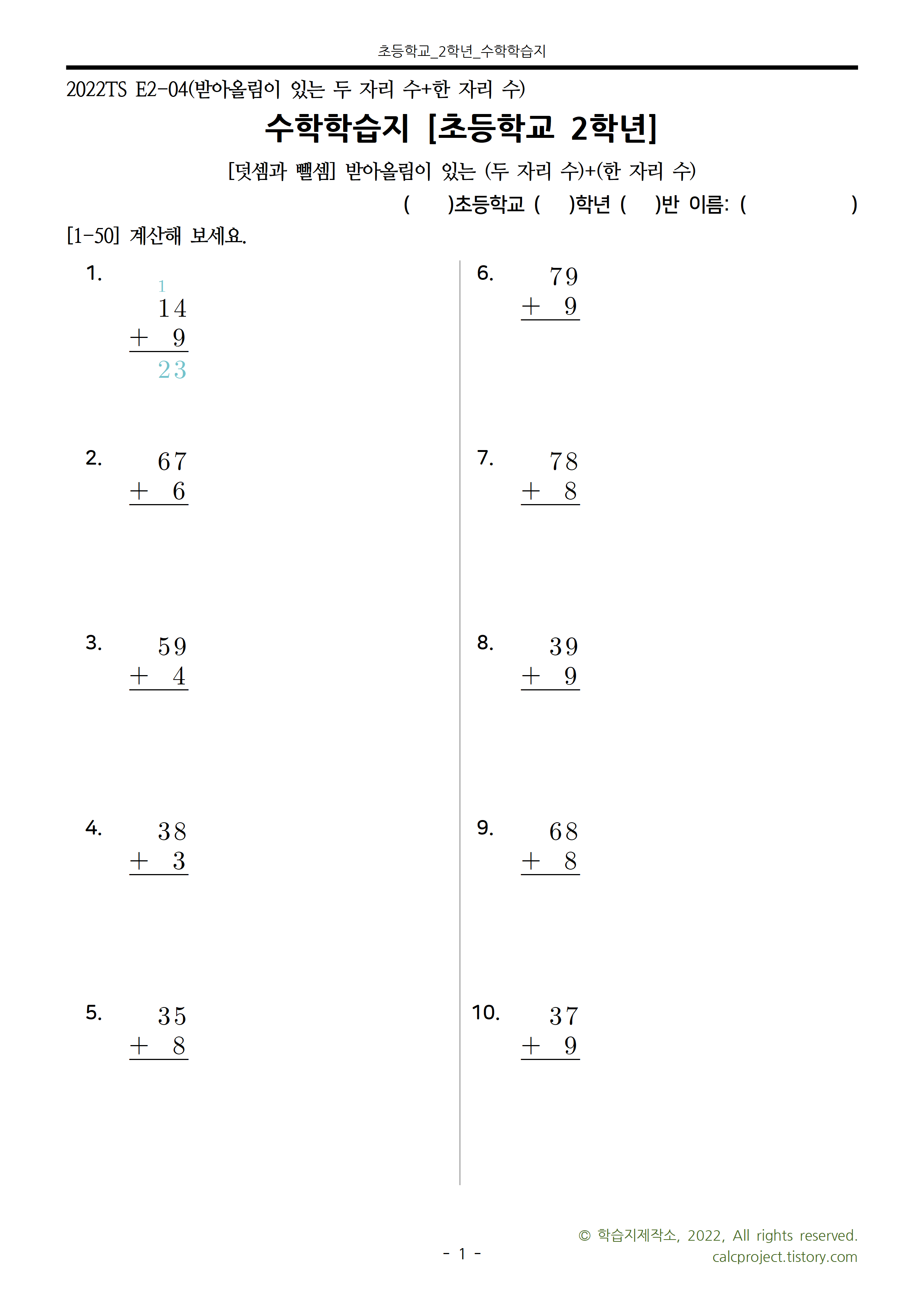 #태그 : 초2, 초등학교2학년, 덧셈과 뺄셈, 받아올림 덧셈 학습지, 초등학교 2학년 받아올림 문제, 학습지제작소