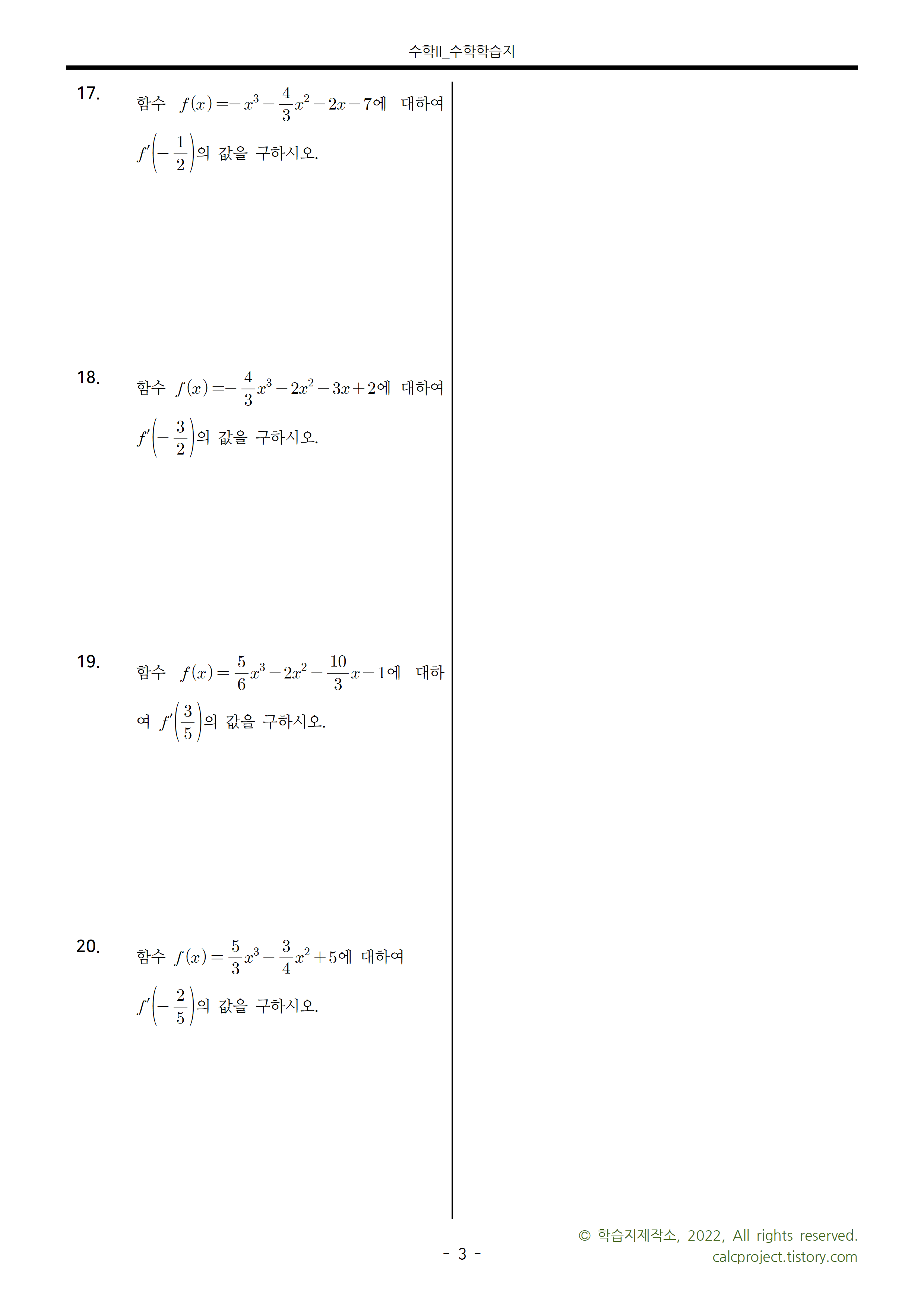 이번 학습지는 다항함수의 미분 중 도함수의 함숫값 구하기를 주제로 다루어보았습니다.