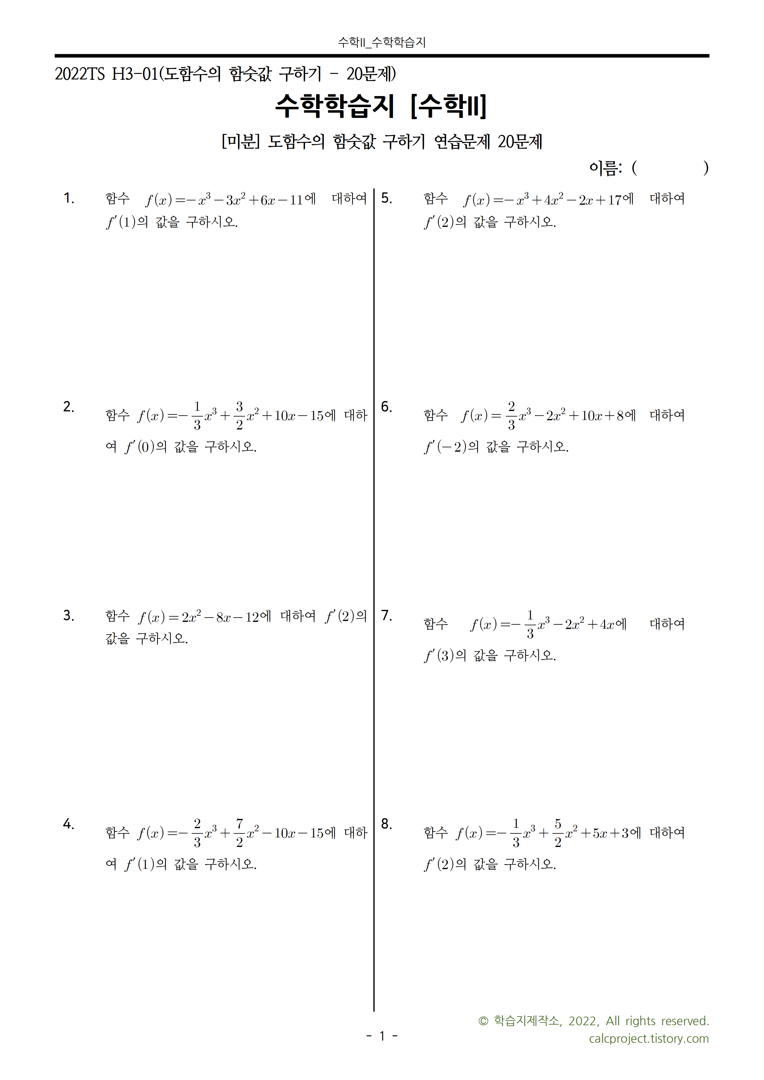 #태그 : 미분, 미분 학습지, 수학2 미분 자료, 수2 미분 학습지, pdf, 다운, 다운로드, 학습지제작소