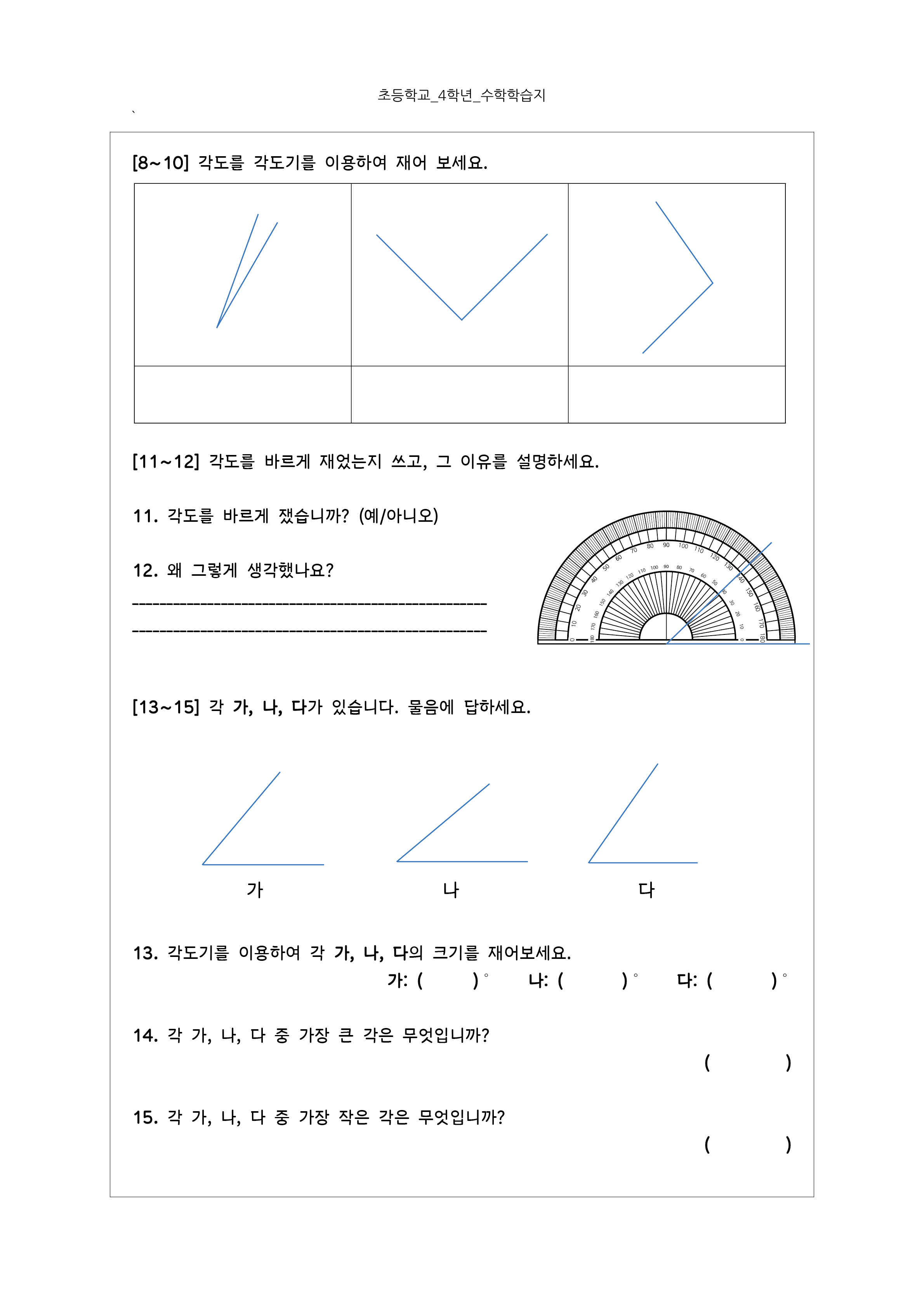 모두 15문제로, 실제로 각의 크기를 재어보는 연습을 할 수 있도록 만들었습니다.